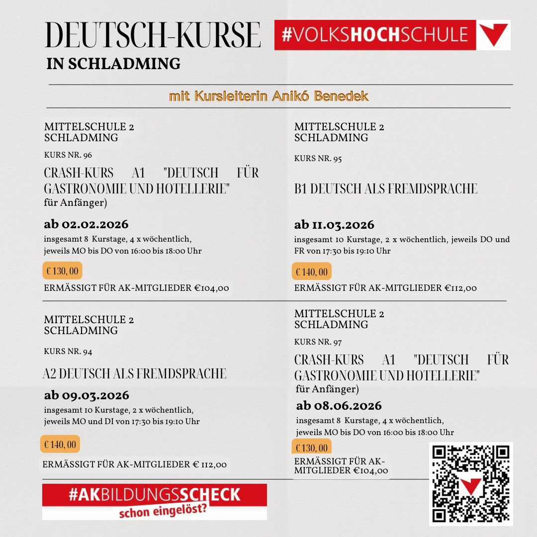 Die Kursteilnehmer:innen erwerben in diesem Kurs Kenntnisse und Fähigkeiten der deutschen Sprache. Den Schwerpunkt stellt dabei einerseits der Wortschatz in der Gastronomie und Hotellerie, andererseits die Konversation allgemein dar. Beide Aspekte sind für Arbeitnehmer:innen nicht-deutscher Muttersprache im Tourismus besonders wichtig.