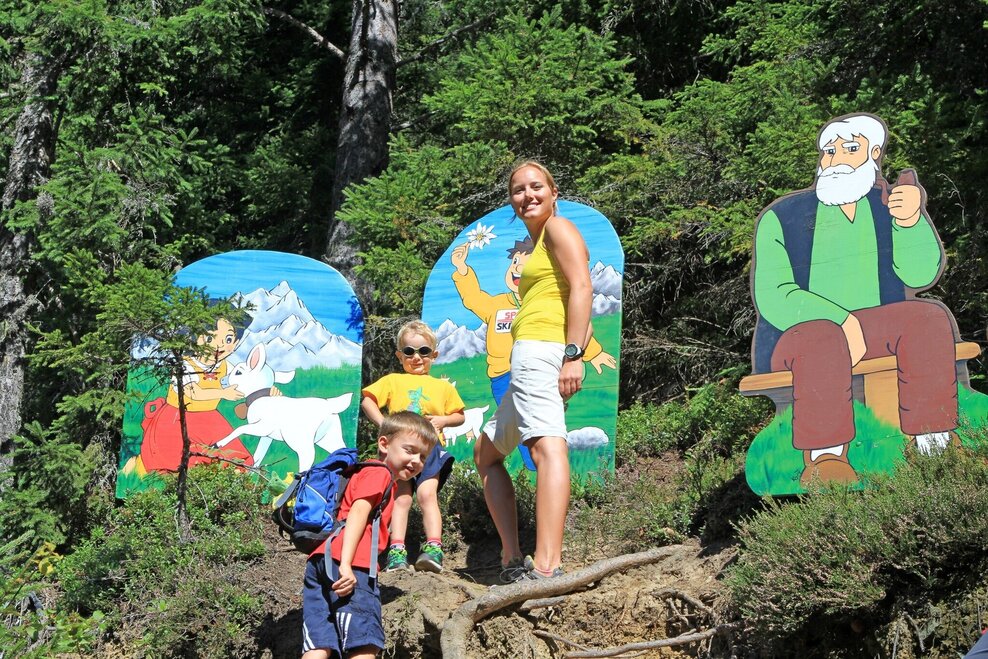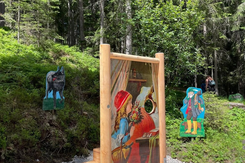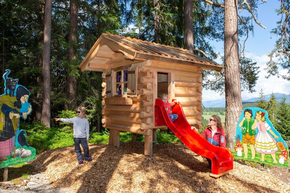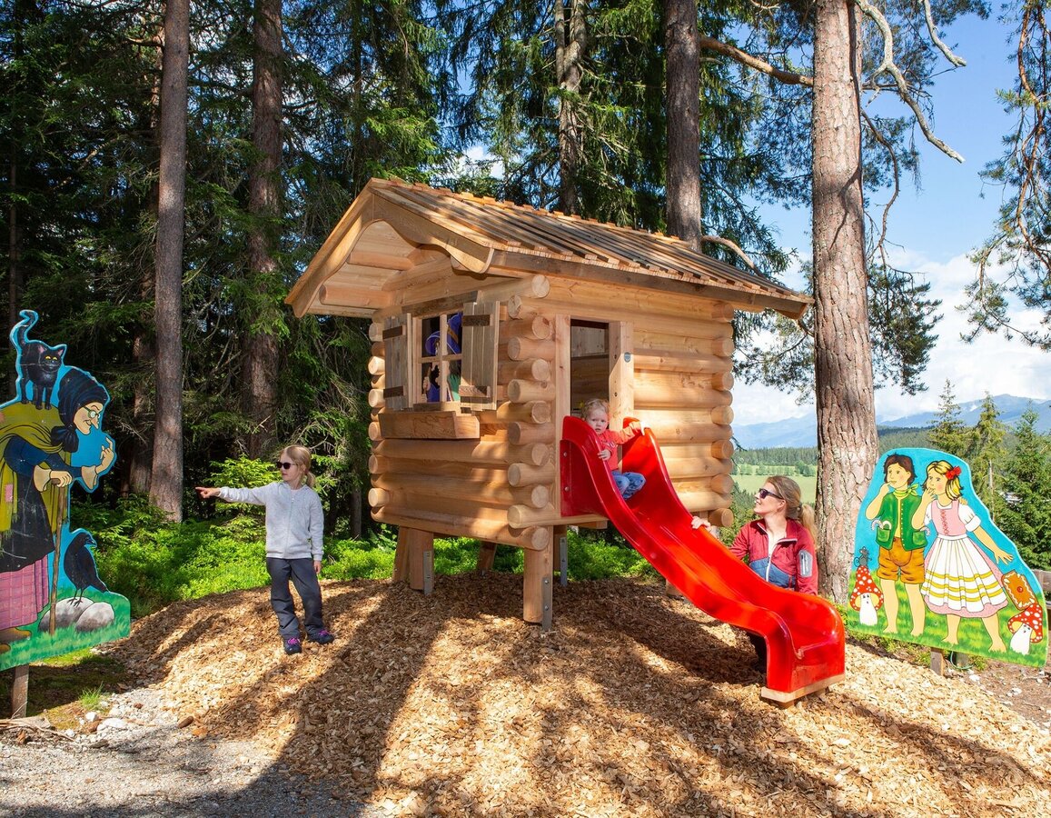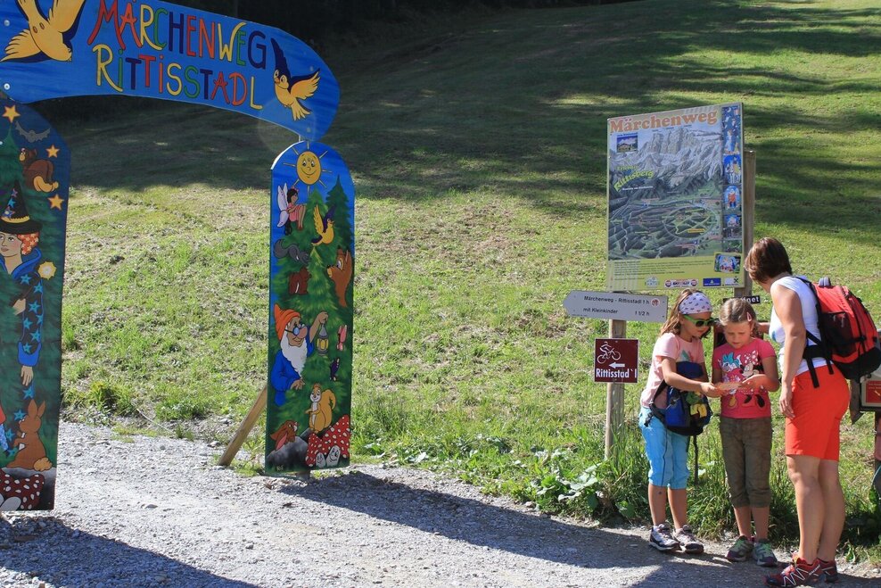 From the Rittisstadl you walk downhill in an easterly direction past the high-altitude playground - with a wonderful view of the Ramsau plateau in front of you. The path turns left and then south via a right-hand bend. Shortly afterwards you join a road. Follow this for about 300 m. Before crossing the alpine pasture, which is the Rittisberg Süd ski run in winter, turn left downhill into the forest. Now follow the fairytale trail through the forest and along various stations into the valley.