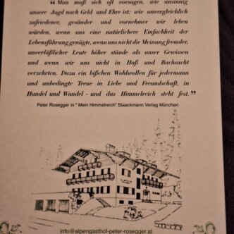 "The sun terrace of paradise" - this is what the writer Peter Rosegger calls Ramsau am Dachstein. The hospitality at the Alpengasthof Peter Rosegger is determined by the guiding principles of the famous author. Here, at our wonderful Alpengasthof, you will learn to switch off from everyday life.