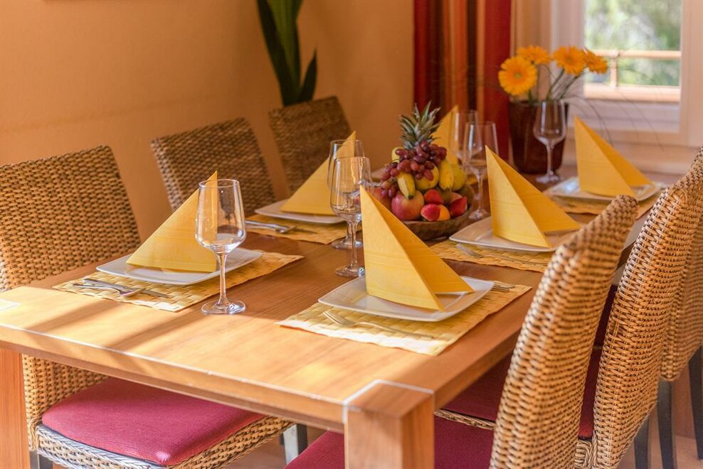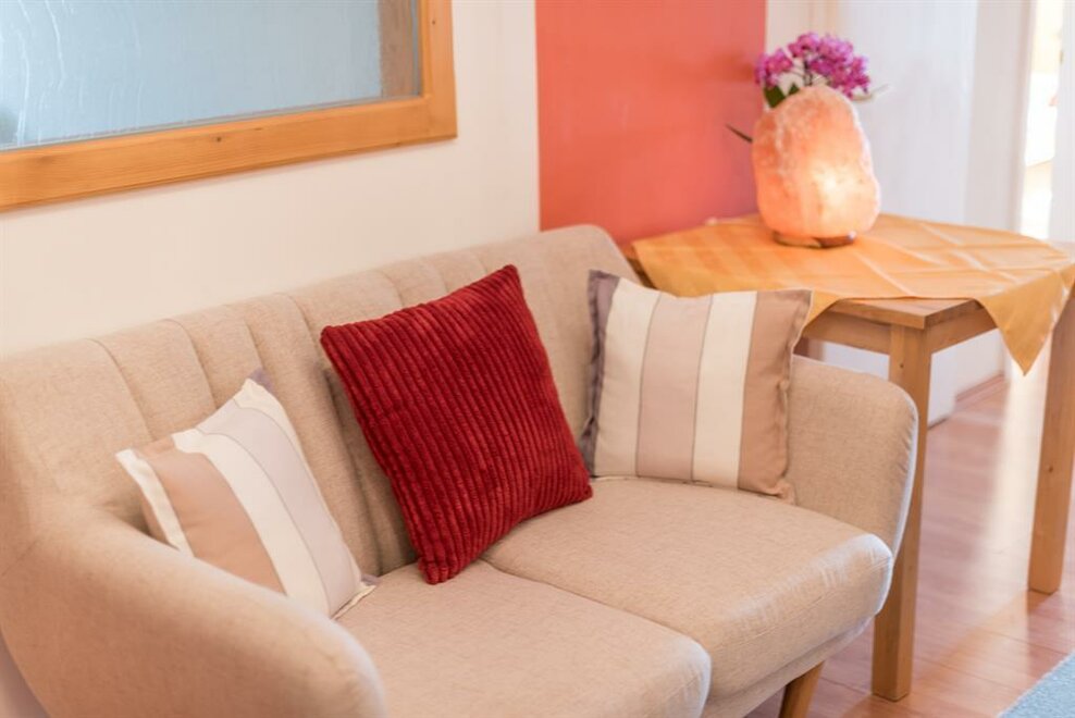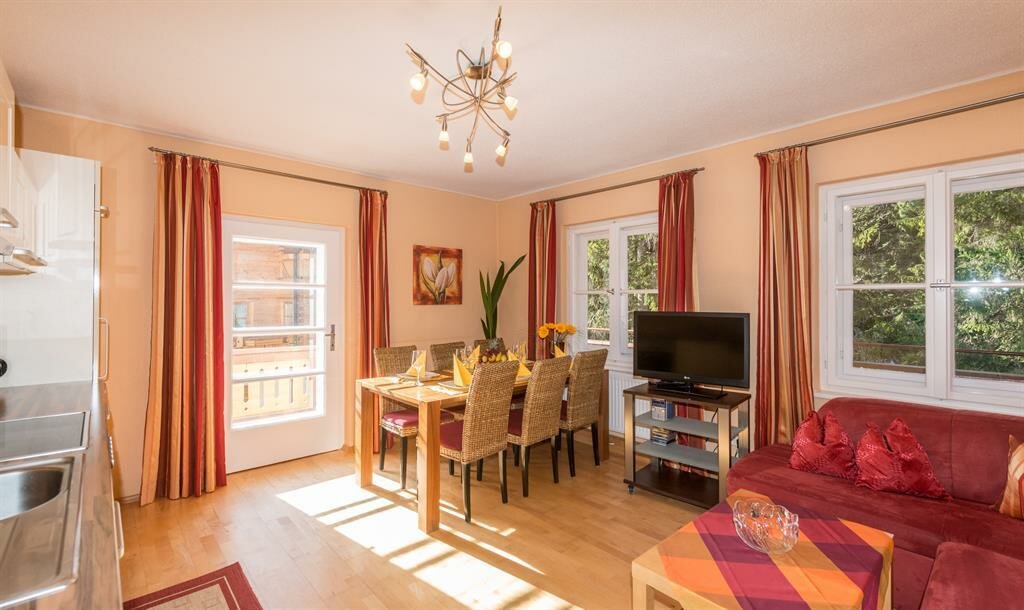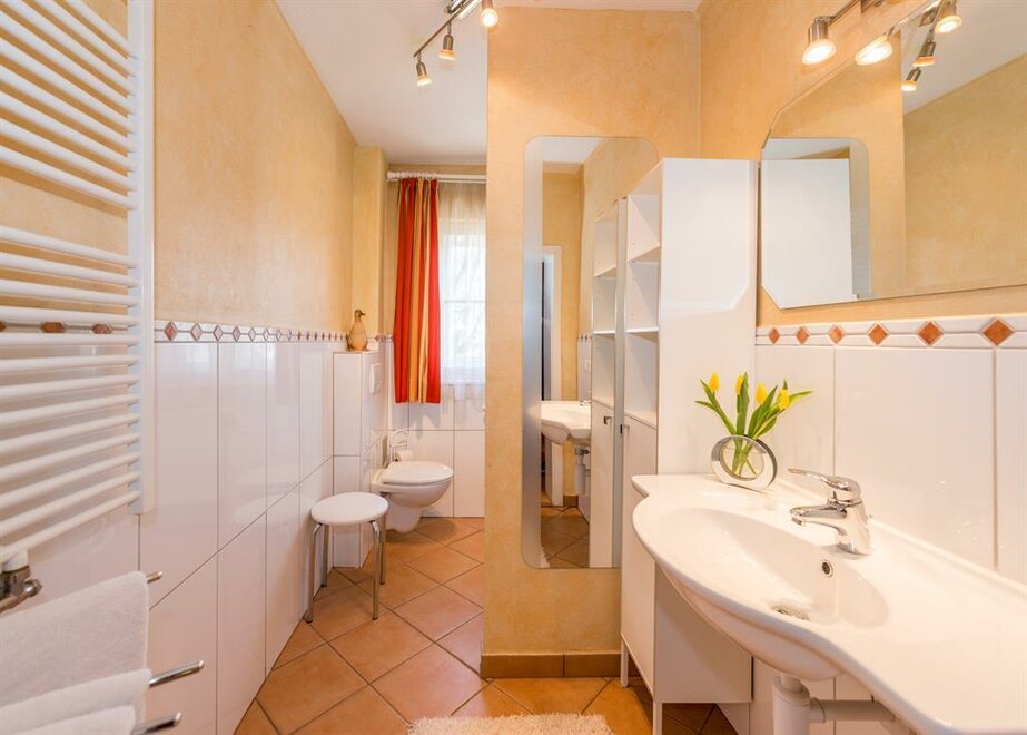 Stylové interiérové zařízení a pečlivě vybrané detaily vytvářejí atmosféru útulnosti a životní radosti. Velikost: 60 m2 * 2 samostatné ložnice * KAŽDÉ ložnice je vybavena sprchou, WC, fénem, plochou TV, rádiem, bezplatným Wi-Fi internetem a telefonem. * Kachlová kamna v obývacím prostoru zajišťují dodatečné útulné teplo. * Exkluzivní kuchyně je vybavena útulným posezením, keramickou deskou se 4 plotýnkami, myčkou nádobí, mikrovlnnou troubou, kávovarem, varnou konvicí, toustovačem, lednicí, mrazničkou, troubou a mnoha dalšími doplňky. * 2 předsíně s šatní skříní oddělují obytný prostor od ložnic. Apartmán v přízemí s terasou.