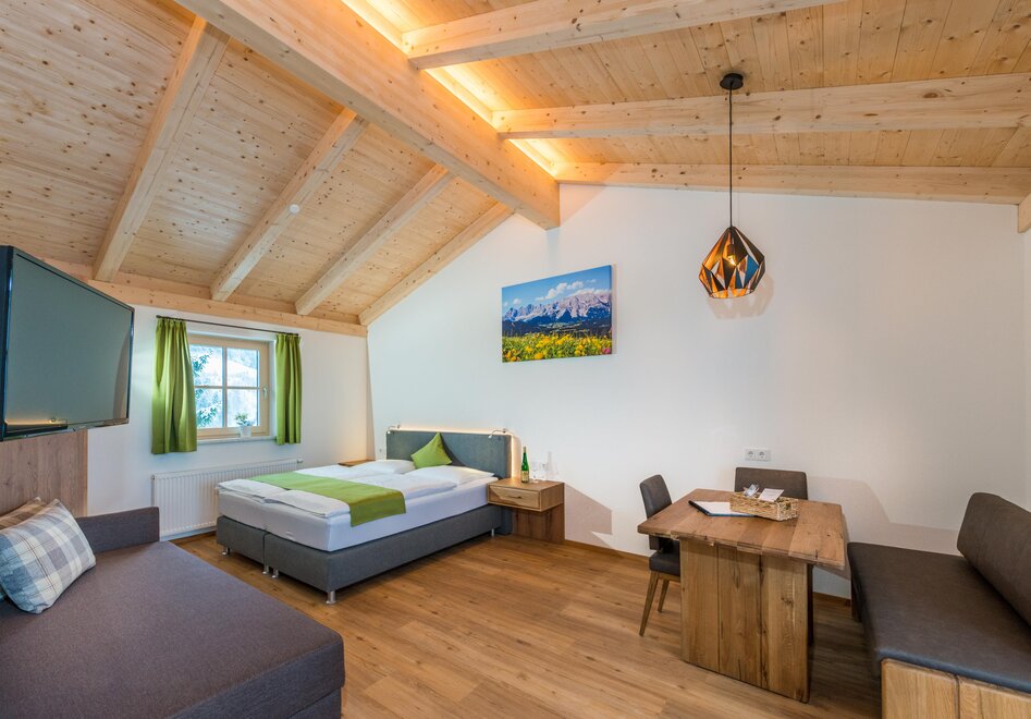Apartmán "Květina" má 31 čtverečních metrů a nabízí místo pro 2 osoby. Disponuje prostornou, moderní místností se sloupovým stropem, boxspringovou postelí, rozkládací pohovkou, plochou televizí a samostatnou koupelnou. Kuchyň je integrována do místnosti a je plně vybavená. Pro větší skupiny až 4 osob lze přikoupit apartmán "Seno" (HeuBlume).