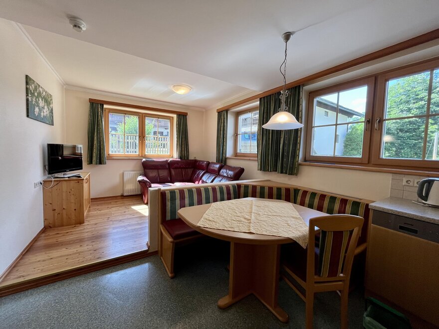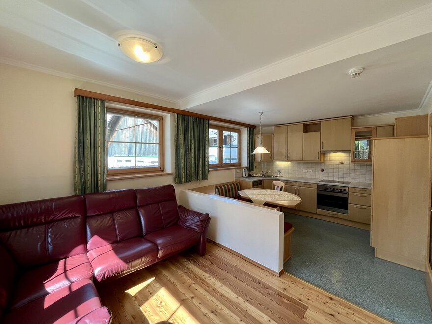 Reiteralm je ve sníženém přízemí, obývací kuchyň se sofa.
