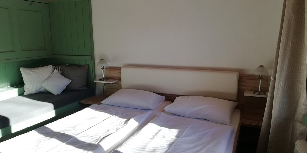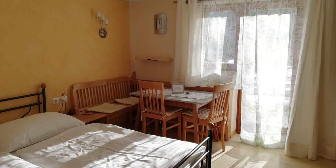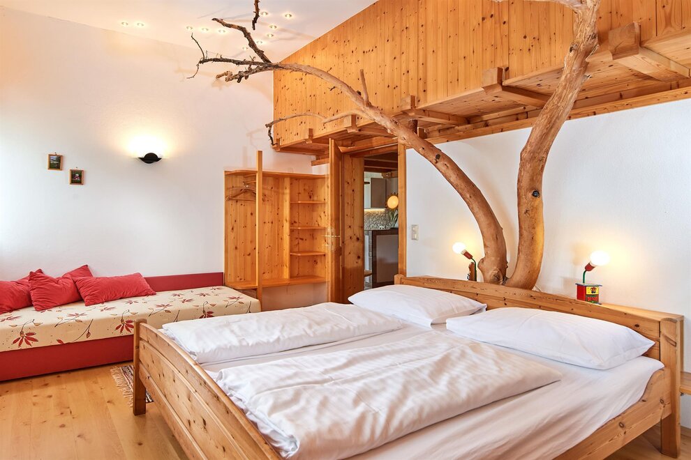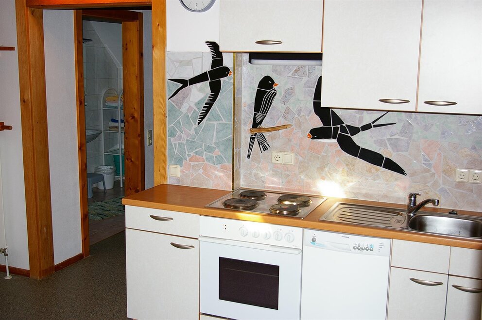 Apartmán "Schwalbennest" v dobrodružném domě, cca 54 m² pro 4 osoby; předsíň, sprcha, oddělené WC, 1 obývací pokoj s manželskou postelí, 1 podkrovní pokoj se 2 lůžky a vzdušným výhledem. Sporák s 4 plotýnkami a troubou, myčka nádobí, lednička s mrazákem, kávovar a rychlovarná konvice, kabelová TV, internetové připojení, WiFi/WLan. Zvýšené posezení s nádherným, volným výhledem okamžitě navodí prázdninovou atmosféru.