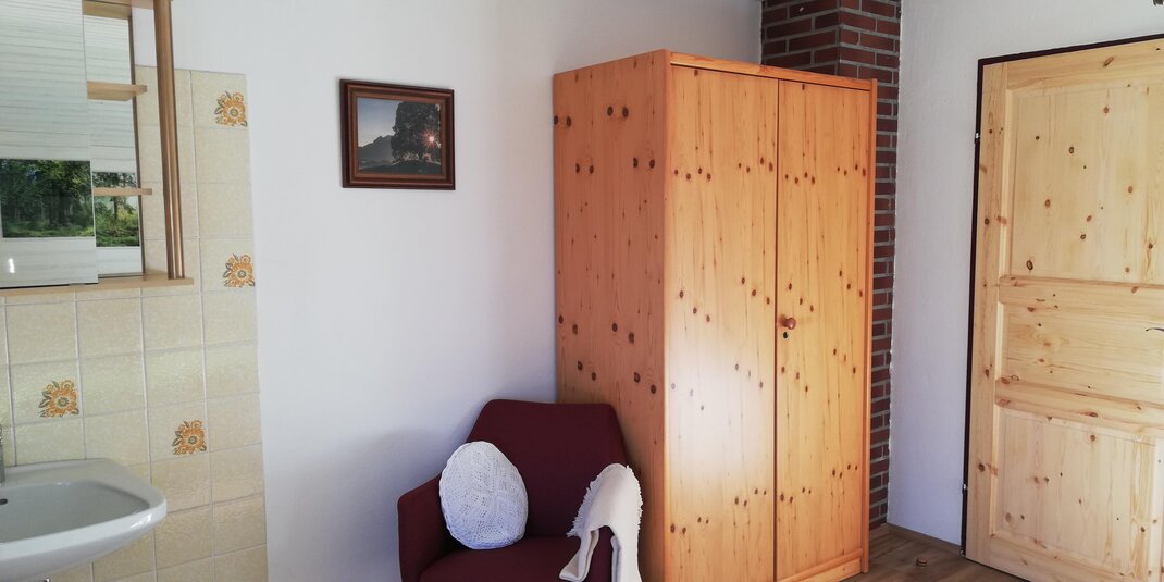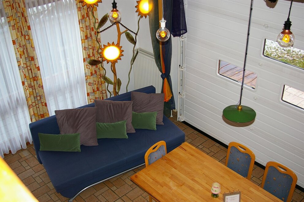 Apartmán "Remise" v dobrodružném domě, cca 78 m² pro 5-6 osob; předsíň, sprcha, WC, 1 ložnice s manželskou postelí a pohovkou a hvězdné nebe. Nad tím je pokoj "Stromový dům" (výška místnosti 165 cm) se 3 postelemi, obytná kuchyň má terasu na východní a jižní straně, sporák se 4 plotýnkami a troubou, myčka nádobí, lednice s mrazákem, kávovar a rychlovarná konvice, pohovka a kabelová TV, internetové připojení, WiFi/WLan.