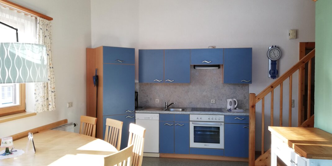 Apartmán "Stoder" o rozloze cca 75 m² pro 4 osoby; 2 ložnice s slunečním balkonem, útulná obývací kuchyně s myčkou, sporák s 4 plotýnkami a troubou, lednice s mrazákem, kávovar a rychlovarná konvice, internetové připojení, WiFi/WLan, kabelová TV, pohovka, nádherný volný výhled na Schladminger-Tauern a pohled na život na farmě a Stoderzinken