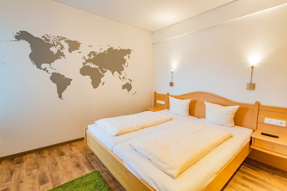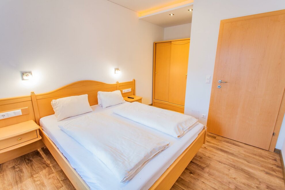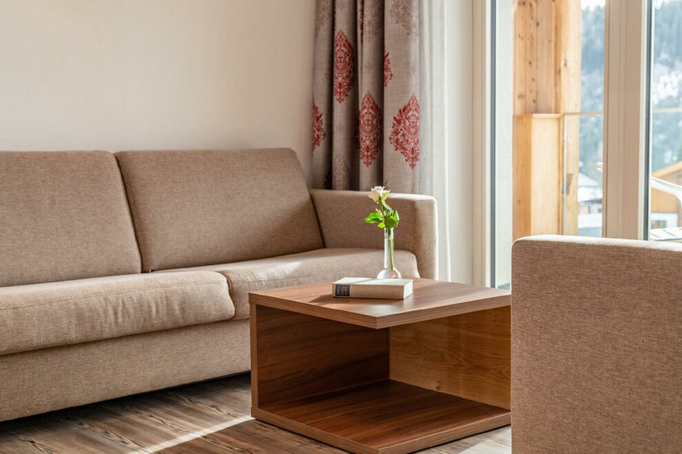 Naše hotelové apartmá "Sinabell" nabízí ložnici s boxspringovou postelí, koupelnu se sprchou, malou kuchyň oddělenou posuvnými dveřmi a obývací pokoj s balkonem a rozkládací pohovkou.