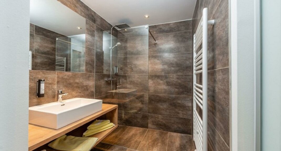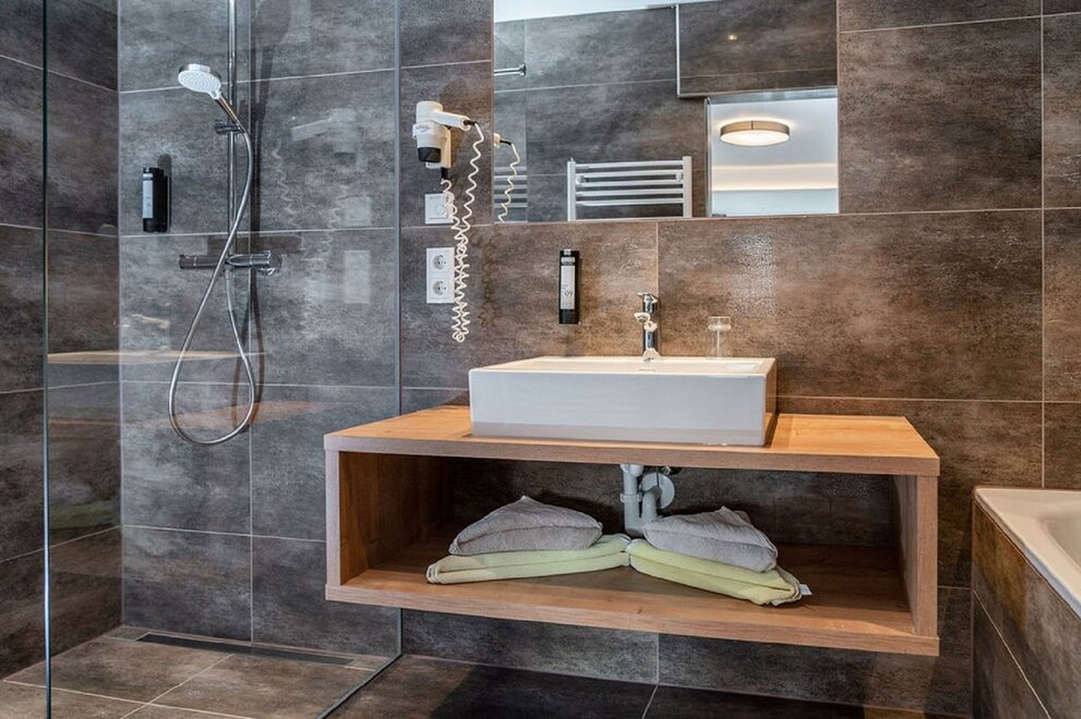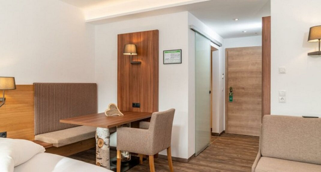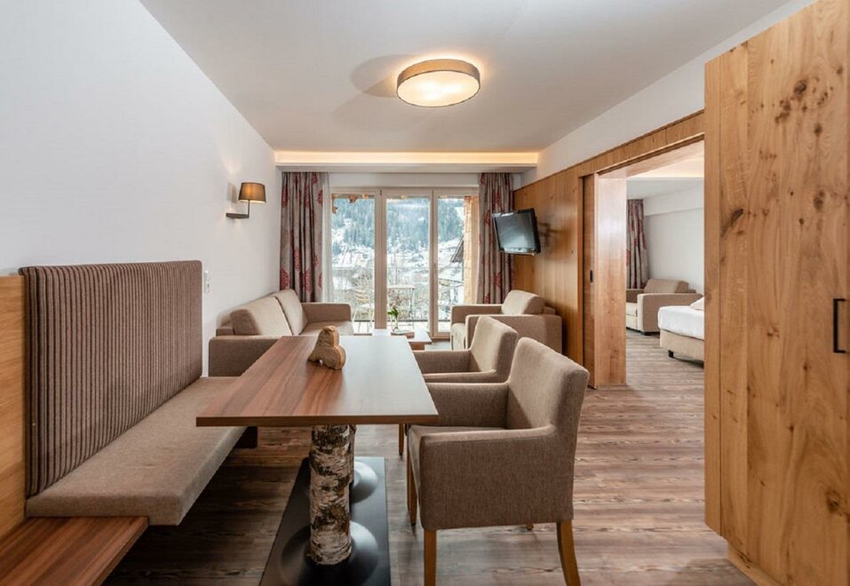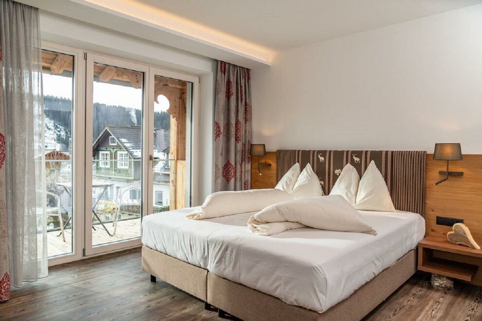 Rodinná suita Ramsau Deluxecca 60 m²Naše "Rodinná suita Ramsau Deluxe" nabízí místo pro celou rodinu. Vybavení - dvě boxspring postele ve 2 místnostech oddělených skleněnými posuvnými dveřmi, obývací pokoj s rozkládacím pohovkou, balkon a lodžie s lounge křeslem, útulný posezení, koupelna se sprchou a vanou, oddělené WC, TV a telefon, stejně jako trezor