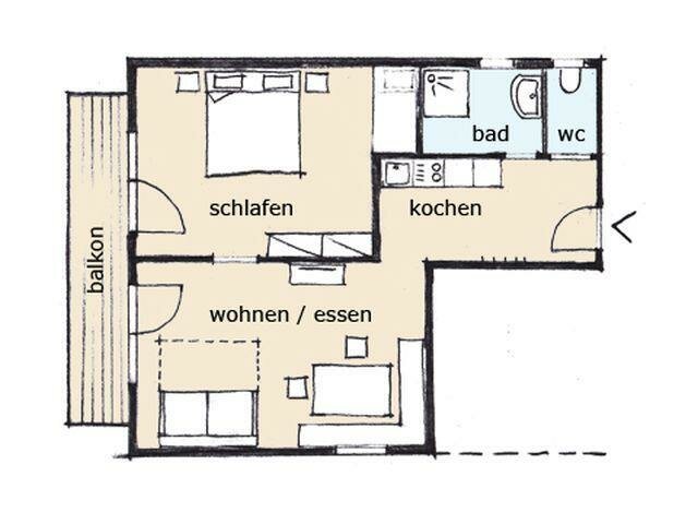 elektrický krb, salonek, trouba, TV, pokoj chráněný před hlukem, možnost mražení potravin, digestoř, rustikální nábytek, vestavěná kuchyň, společný obýv./ložnice, prostírání a prádlo do kuchyně, Größe m²: 44, varná konvice, povlečení k dispozici, balkón (někde), nádobí k dispozici, dřez na mytí nádobí, samostatná ložnice: 1, balkón, satelitní TV, kávovar