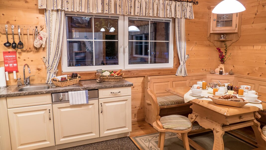 - Plně vybavená otevřená kuchyň s jídelním koutem a velkým jídelním stolem v selské stylu