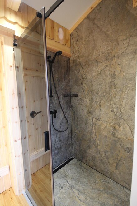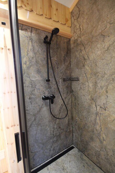 - Prostorná koupelna se sprchovým koutem a umyvadlem