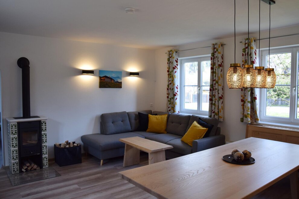 A large, cozy lounge with a fireplace, satellite TV and a comfortable couch invites you to relax. There is also a large seating area where everyone can eat together.