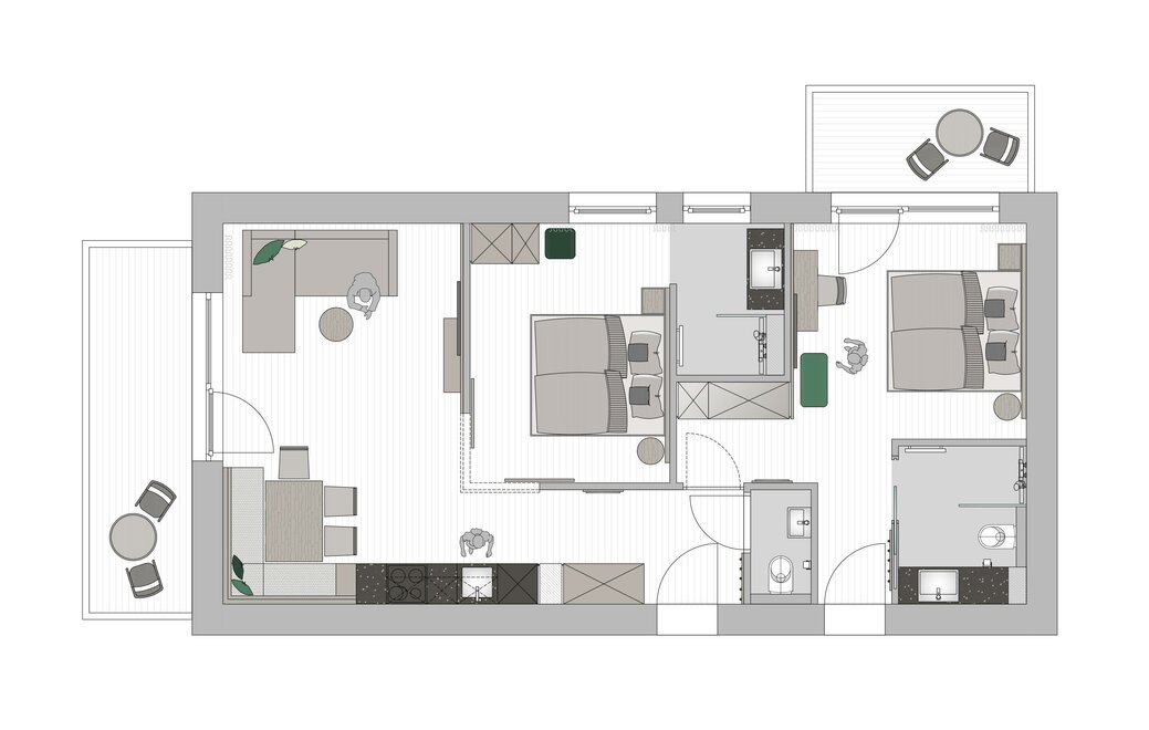 Naše 75 m² Apartmá deLuxe nabízí prostor pro až 6 osob a vše, co potřebujete pro příjemný relaxační čas: plně vybavená kuchyň s jídelním koutem, útulná obývací část se sofa a kabelovou televizí pro pohodlné večery, a 2 balkony k vychutnání odpoledního slunce.