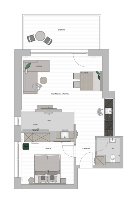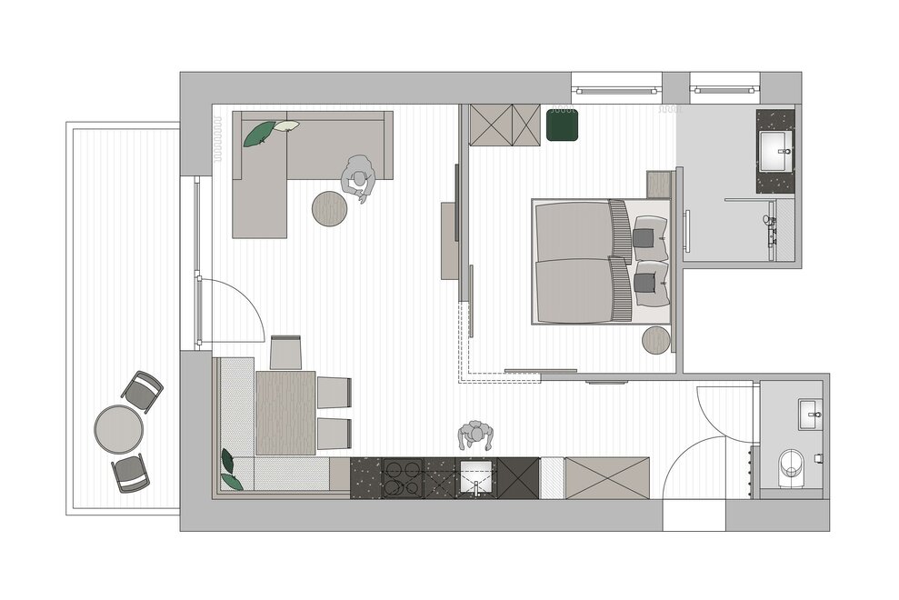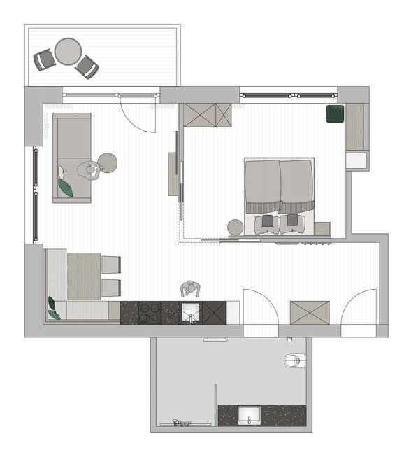 Naše Studio Premium nabízí místo až pro 4 osoby. Moderní a plně vybavená kuchyň s jídelním koutem, obývací část s kabelovou televizí a pohovkou a terasa orientovaná na sever poskytují dostatek prostoru pro odpočinkové hodiny.\\ 1 ložnice s boxspringovou postelí