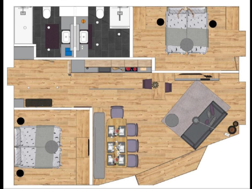 Ložnice 1 má vlastní koupelnu, kam se dostanete pouze malou chodbou, ložnice 2 má „koupelnu en suite“. Ložnice jsou vybaveny manželskými postelemi, které lze přetvořit na jednotlivá lůžka, a každá má chytrou TV. Díky pohodlné rozkládací pohovce v obytné části mohou pohodlně přenocovat další 2 osoby.