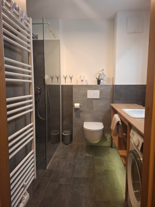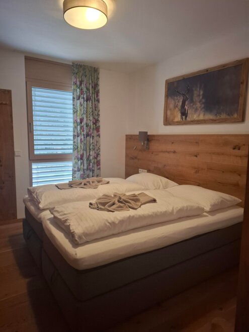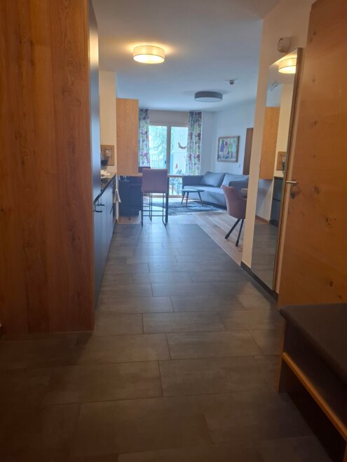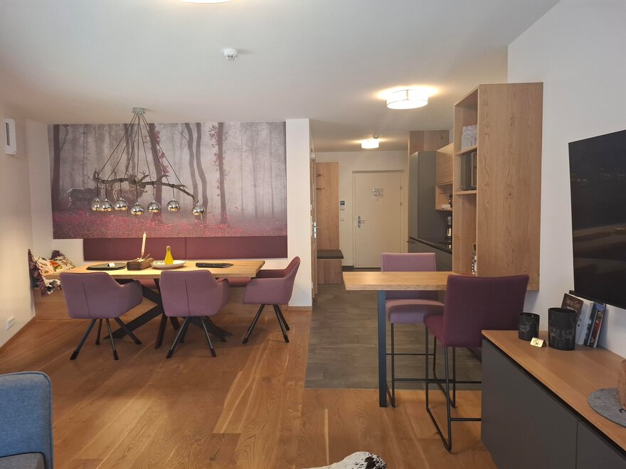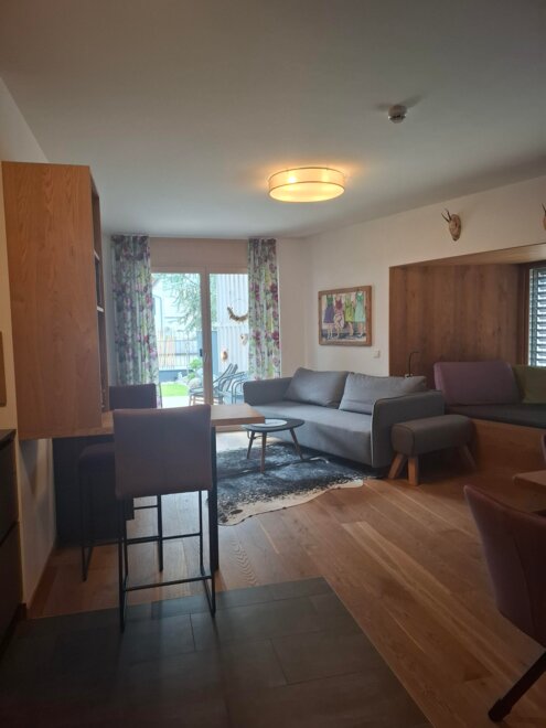 Apartmán ALPENKRONE nabízí 70 m² obytné plochy v přízemí s velkou terasou a malou zahrádkou. Otevřený obytný prostor o velikosti 30 m² je vybaven plně zařízeným kuchyňským koutem s troubou, mikrovlnnou troubou, kávovarem a příslušenstvím, jídelním koutem a posezením, které je s velkou péčí o detaily zařízeno v moderním alpském stylu v pestrých barvách.
