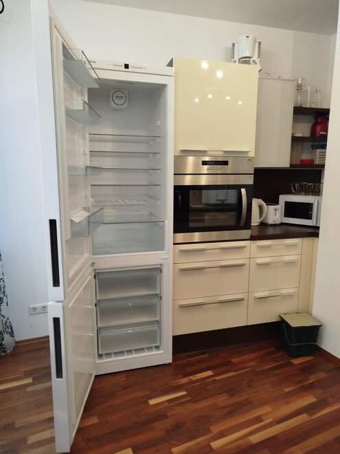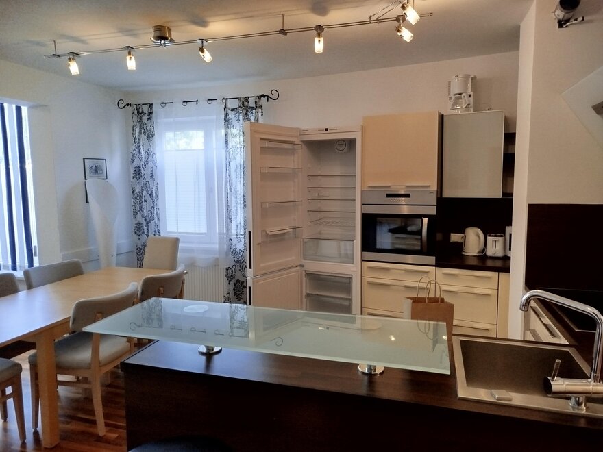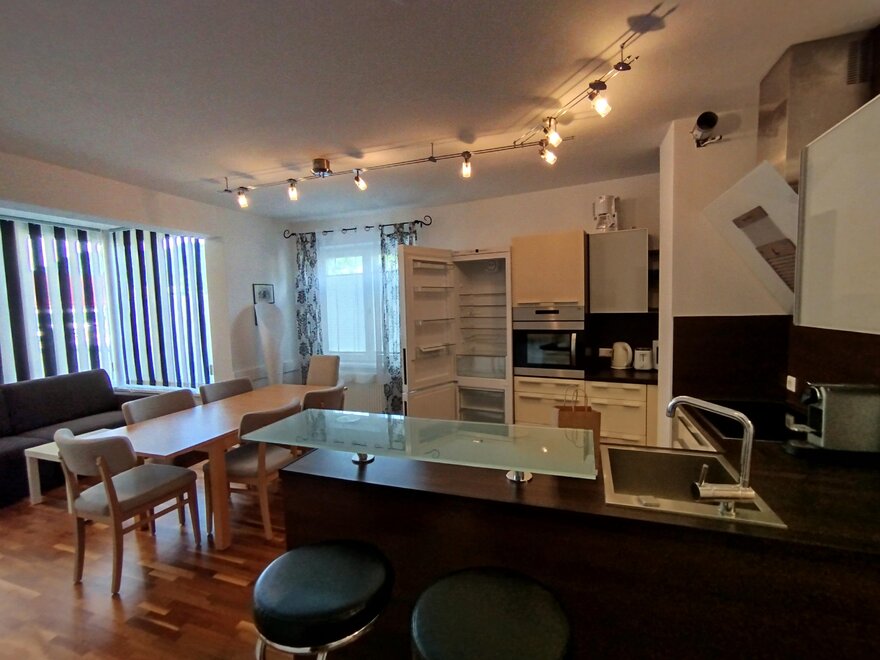 Apartmán má plně vybavenou kuchyň, prostornou jídelnu a obývací prostor, koupelnu s dvojitým umyvadlem a samostatné WC.