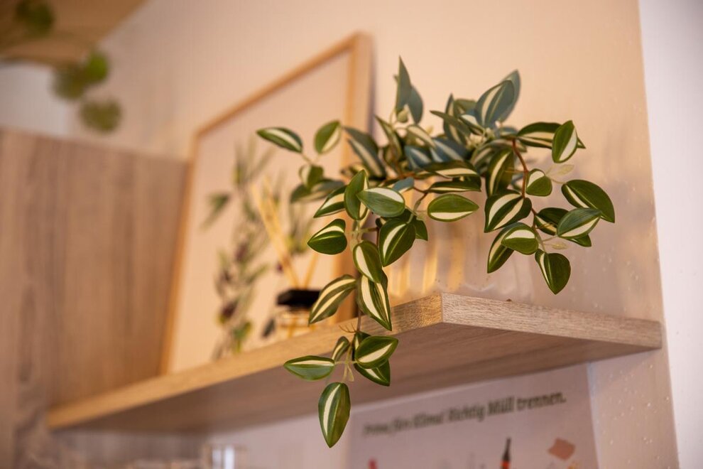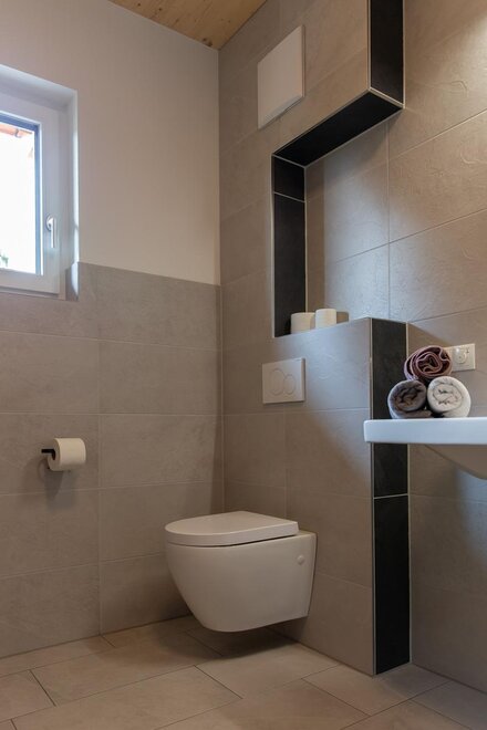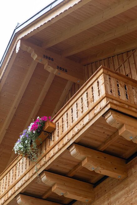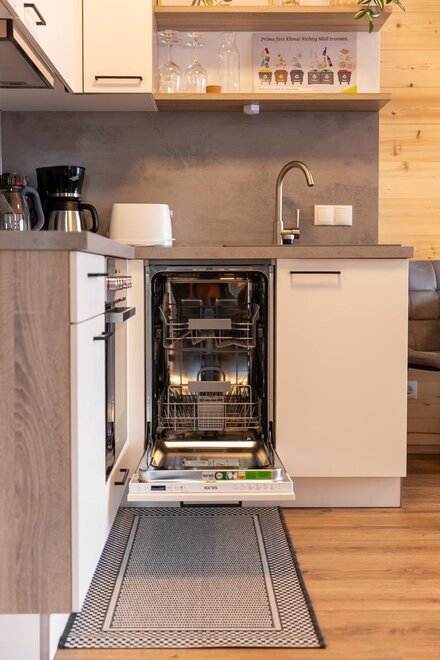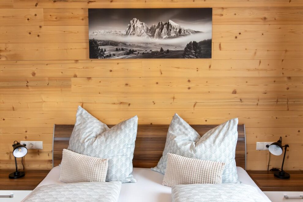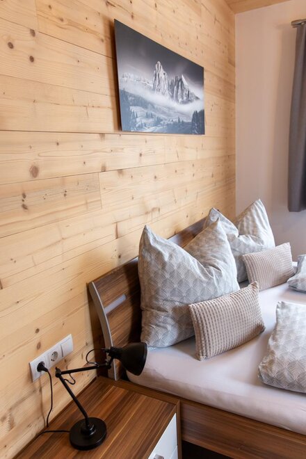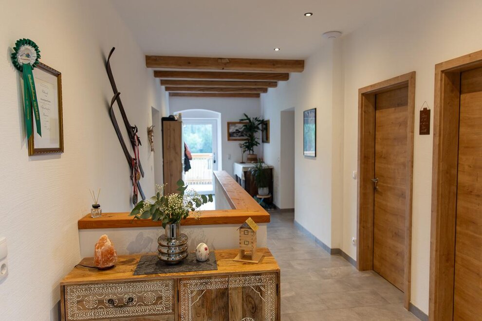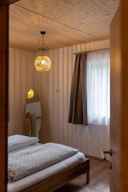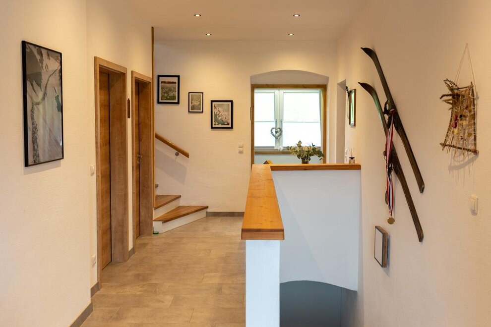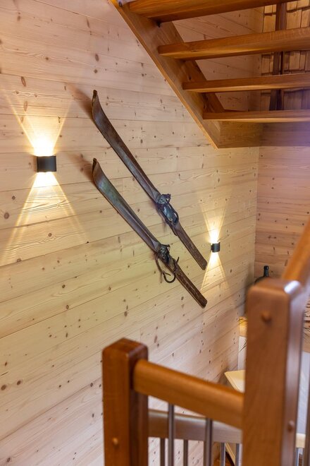 Po společně sdíleném schodišti se dostanete do moderně zařízené obytné jednotky. Ta okouzlí útulným alpským stylem s mnoha dřevěnými prvky.