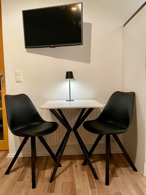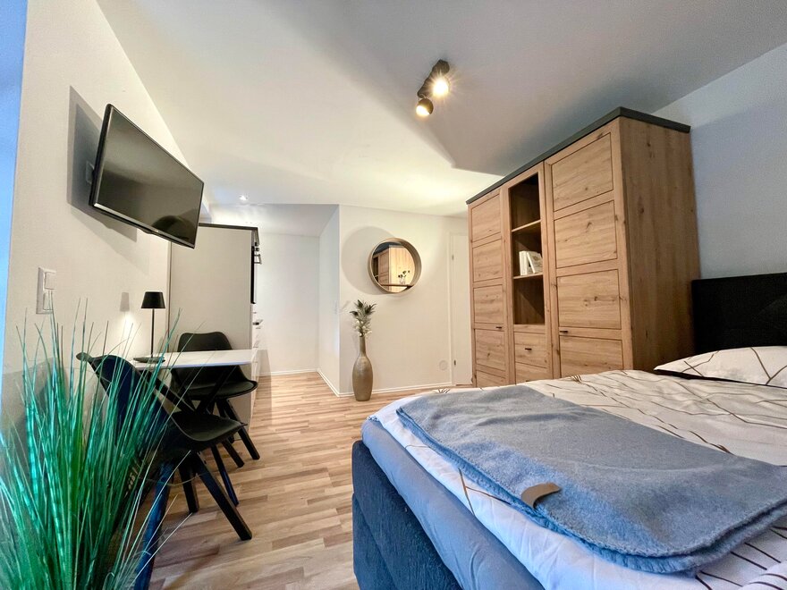 Apartmán s vysokou kvalitou, kingsize postel, skříň, kuchyňský kout s myčkou, lednice s mrazákem, sporák s troubou, kuchyně je vybavena vysoce kvalitním kuchyňským náčiním, utěrky k dispozici, 1 x ložní prádlo a 1 sada ručníků zahrnuta v ceně, koupelna se sprchou a toaletou, plochý TV, bezplatné WLAN, malý stůl se 2 židlemi, odkládací prostor na boty, šatní skříň, stůl a 4 židle na zastřešené terase.