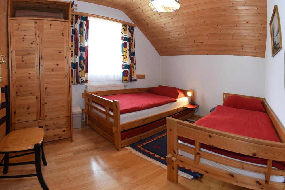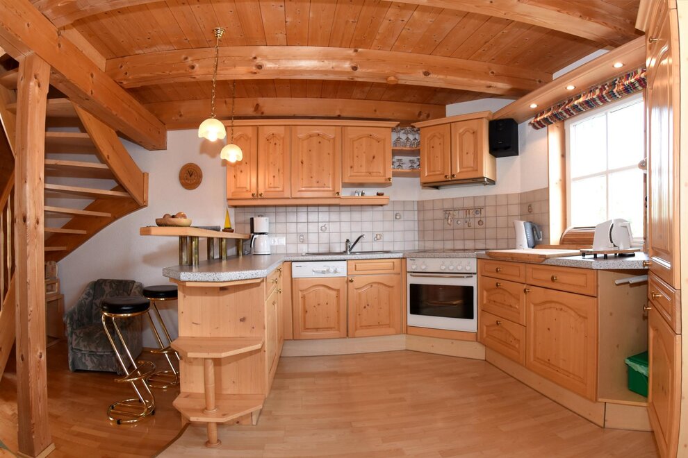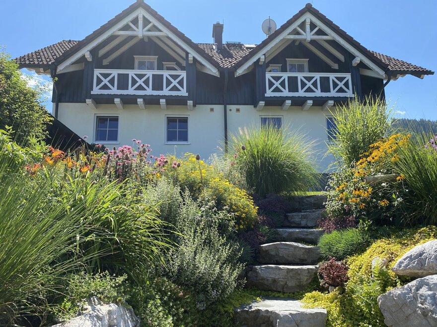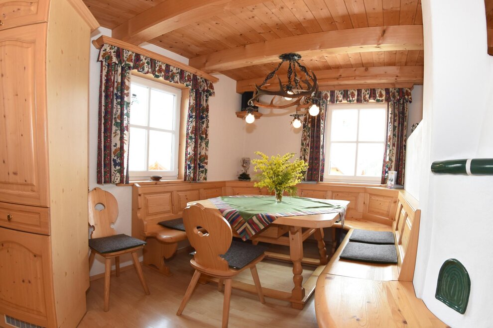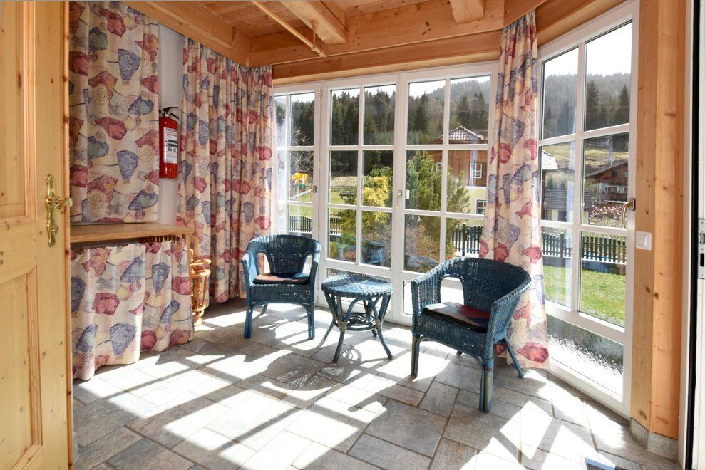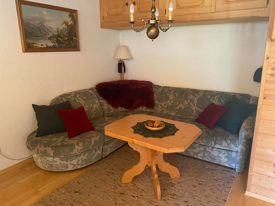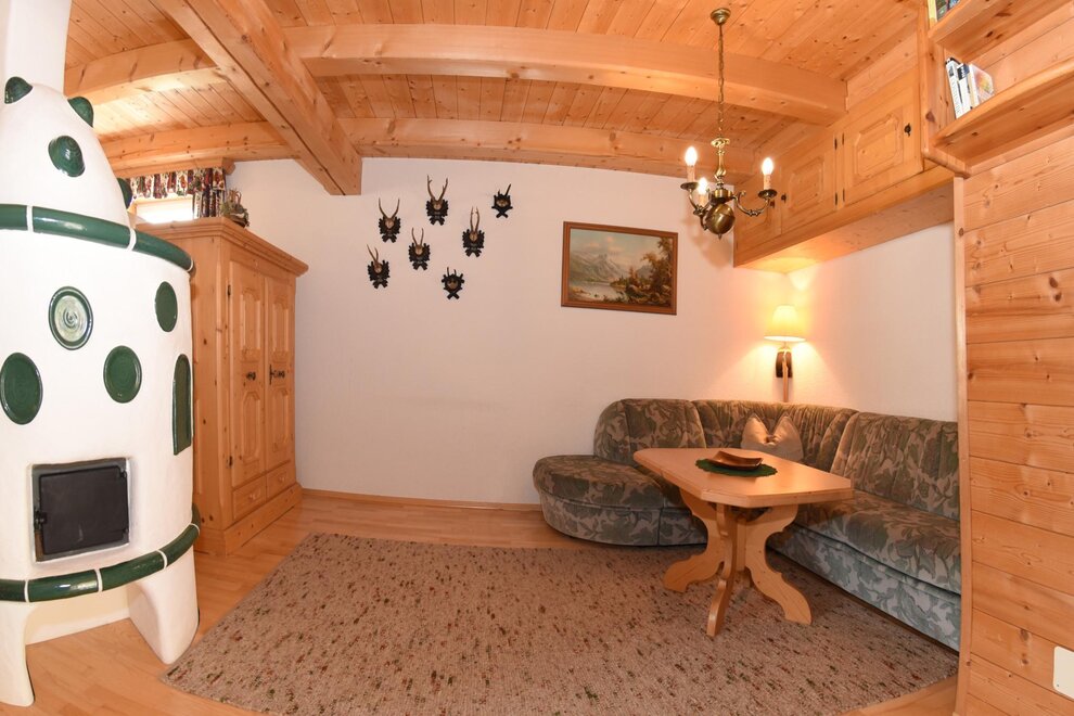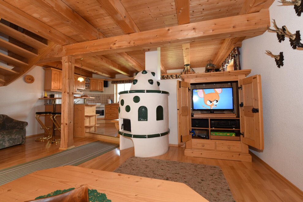 Apartmán vybavený mnoha dřevěnými prvky **** pro 2 - 6 (8) osob nabízí zimní zahradu se sušičkou na lyžařské boty. Plně vybavená kuchyň se sporákem/troubou, myčkou, ledničkou/mrazničkou, varnou konvicí, toustovačem, kráječem na chléb. Obývací prostor se SAT-TV, kachlovým krbem (ústřední topení), herním koutem, HiFi soupravou s CD přehrávačem. 1 toaleta v přízemí a koupelna s toaletou v 1. patře s podlahovým topením, sušičkou na ručníky, sprchou, fénem, dostatečným množstvím ručníků a pračkou. Dvě ložnice s manželskou postelí, přičemž 1 pokoj má balkón s nádherným panoramatickým výhledem, a pokoji se patrovou postelí.