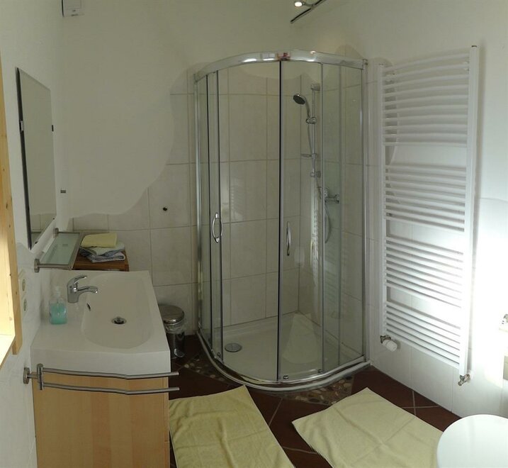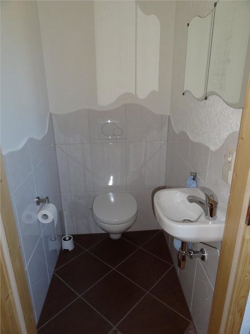 oddělené WC, tekoucí studená/teplá voda, dvojité umyvadlo, sprcha, WC