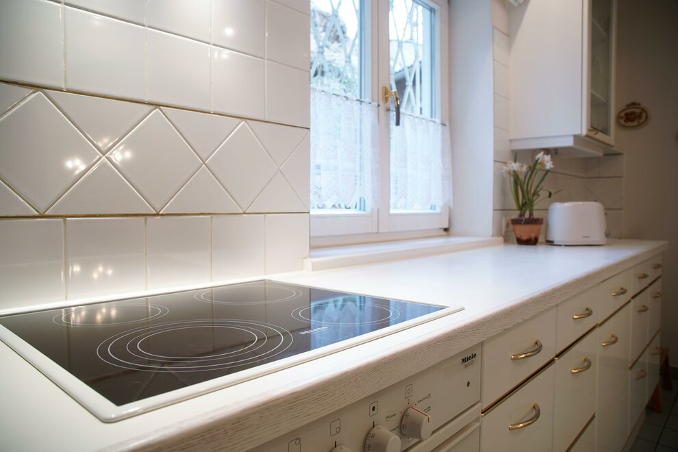 Plně vybavený kuchyňský kout se systémem myčky, sporákem, troubou a lednicí.