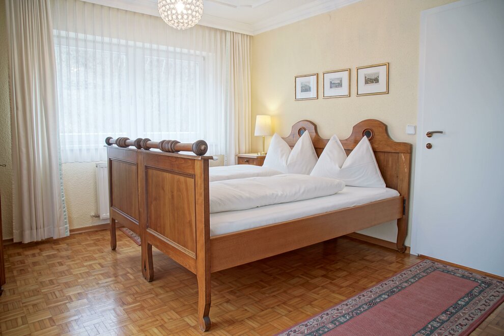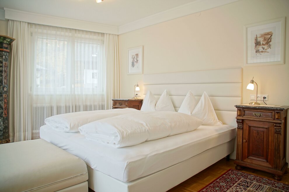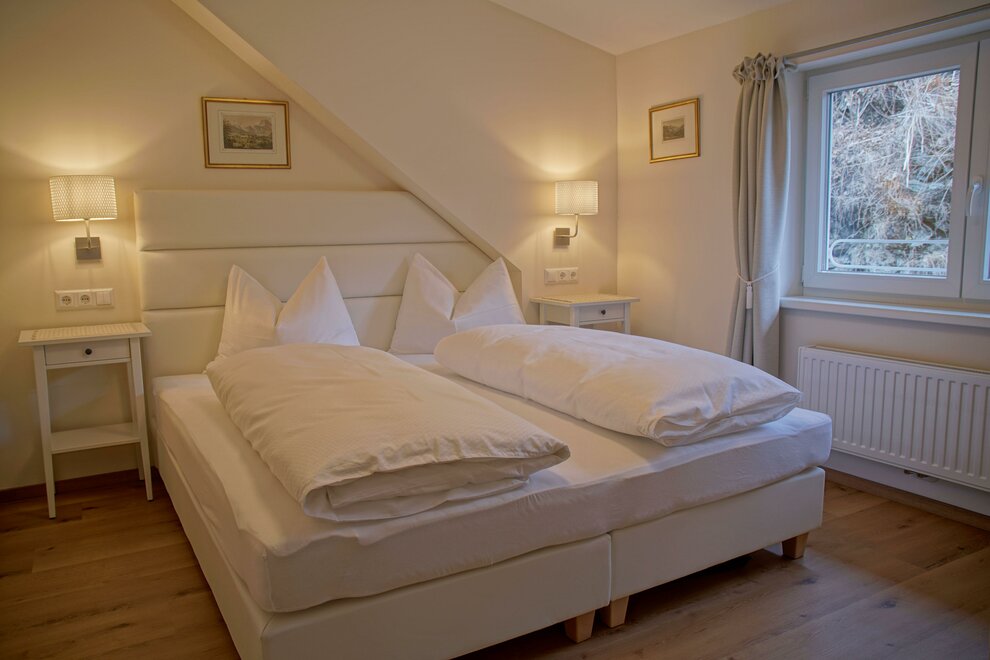 Prostorný apartmán se dvěma ložnicemi s boxspringovými postelemi, koupelnou a samostatným WC.