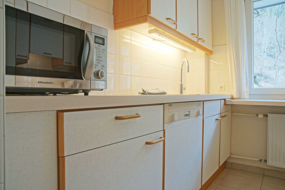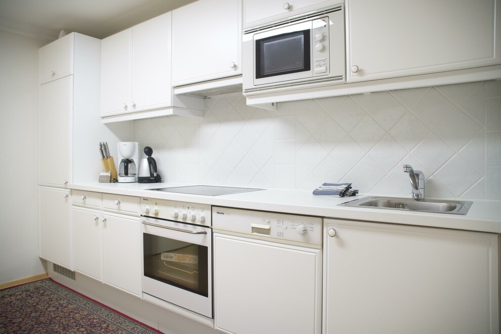 Plně vybavená kuchyně s myčkou, sporákem, troubou, mikrovlnnou troubou a chladničkou.