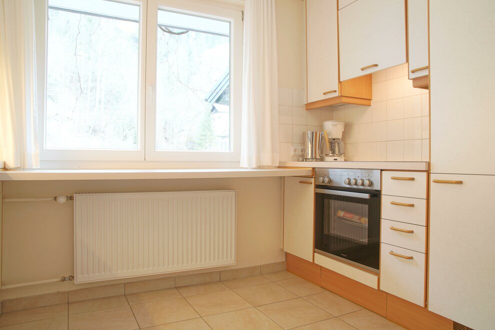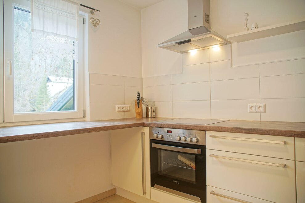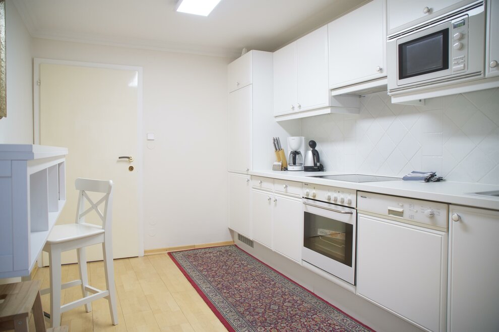 Plně vybavená kuchyň se sporákem, troubou, mikrovlnnou troubou a ledničkou.