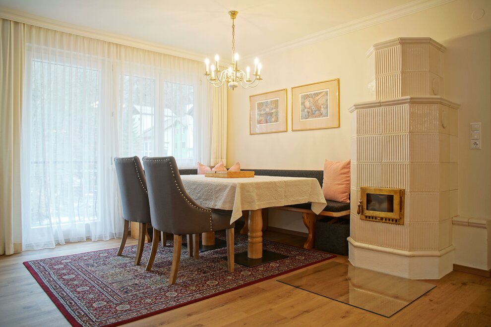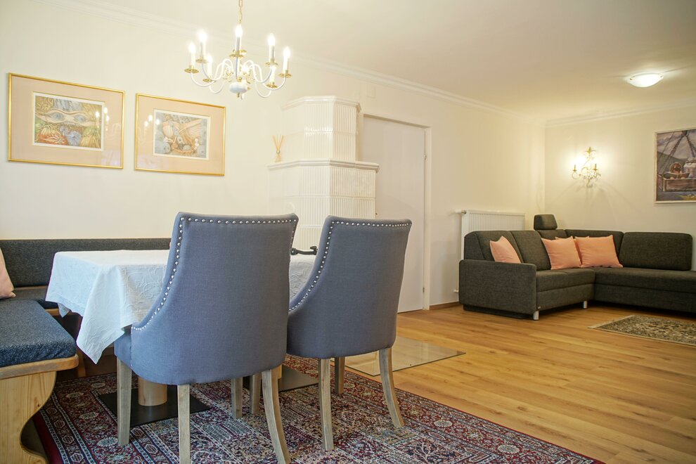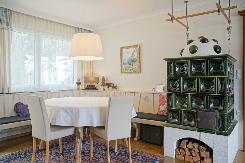 Prostorný obývací a jídelní pokoj se rozkládací pohovkou a kachlovými kamny.