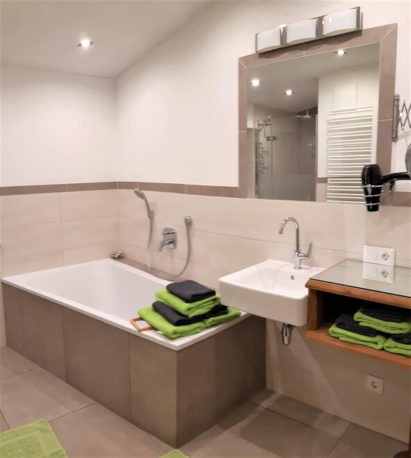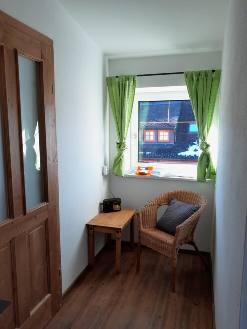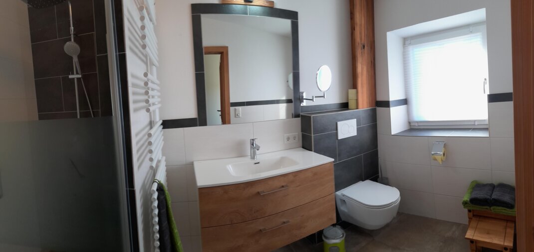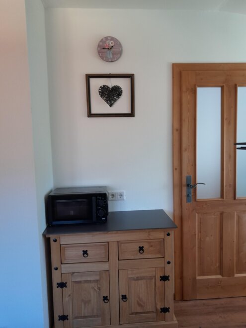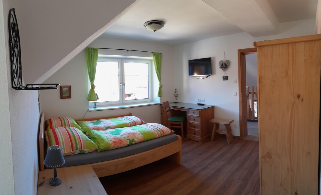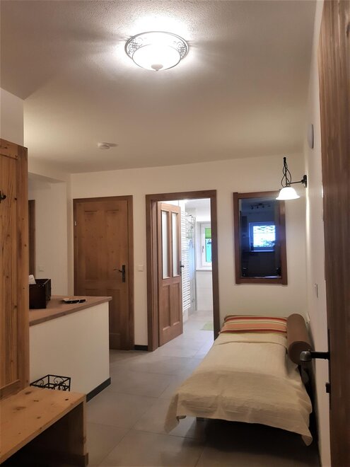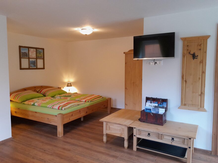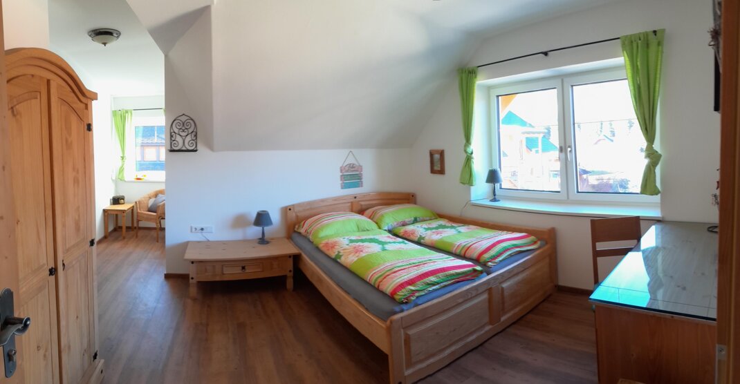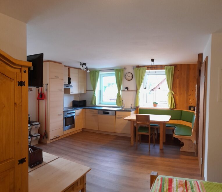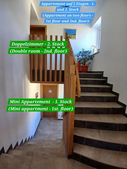 Naše apartmá na 2 patrech (mini apartmá a dvoulůžkový pokoj) je určeno pro 4 osoby a bylo nově postaveno na Berndlhofu v roce 2023. Mini apartmá nabízí v 1. patře nádhernou venkovskou atmosféru pro načerpání sil a pohodlí. Disponuje velkou manželskou postelí (200 x 205 cm), malou integrovanou, plně vybavenou kuchyňskou linkou, útulným rohovým gaučem a koupelnou s WC a sprchou. Dvoulůžkový pokoj se nachází přesně nad mini apartmá v 2. patře a má velkou postel 160 x 200 cm, stůl, čtecí koutek, komodu s varnou konvicí, mikrovlnnou troubou, topinkovačem a několika kuchyňskými potřebami a samostatnou koupelnu s WC a sprchou.