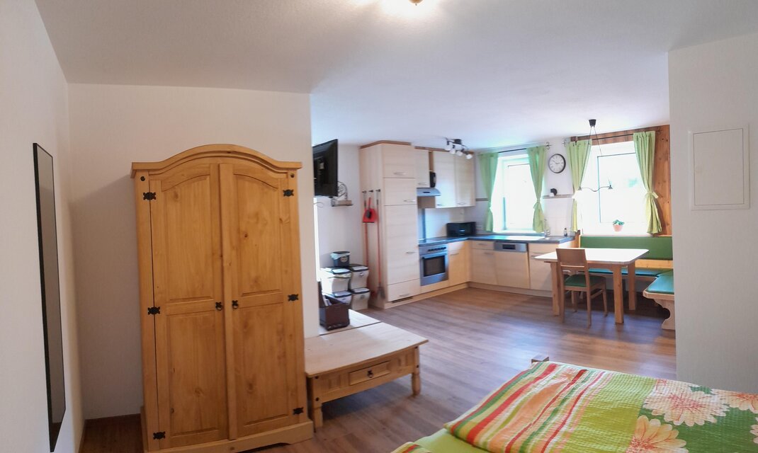 Mini apartmán Kammblick je malý byt, který se nachází v 1. patře a nabízí na cca 30 m² přátelskou atmosféru s prostorným vybavením pro 2 osoby a nádhernou venkovskou atmosféru k načerpání sil a pohodě. Apartmán je pečlivě a komfortně zařízený dřevěným nábytkem. Disponuje velkou manželskou postelí (200 x 205 cm), TV, rádio, zavazadlovým stojanem, šatnou, malou integrovanou plně vybavenou kuchyňkou, útulným rohovým posezením (pro 4 až 5 osob) a koupelnou s WC a sprchou. Apartmán nabízí výhled na Kammspitze a na ulici v Zirtingu.
