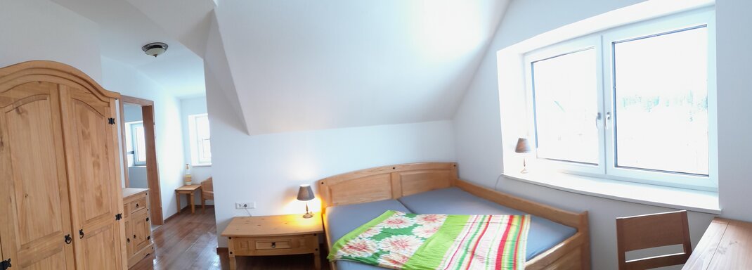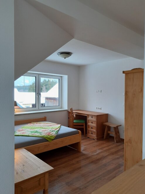 Dvoulůžkový pokoj (cca 23 m²) se nachází přímo nad mini bytem ve 2. patře a disponuje postelí o velikosti 160 x 200 cm, skříní, šatníkem, psacím stolem, komodou s varnou konvicí, mikrovlnnou troubou, topinkovačem a některými kuchyňskými pomůckami a samostatnou koupelnou s WC a sprchou. Dále je před koupelnou malý kout pro čtení se křeslem.