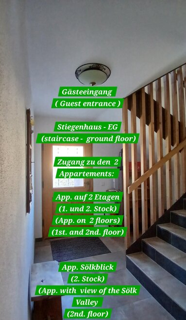 Apartmán Sölkblick nabízí na ploše cca 68 m² přátelské prostředí s rozsáhlým vybavením pro 4 osoby až maximálně 6 osob: 2 ložnice s televizí, stolem a skříní. Obě ložnice mají double postel (180 x 200 cm) a jedna z nich má navíc samostatné lůžko. Pohovka pro 1 osobu v předsíni;