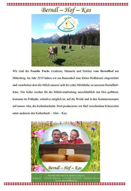V roce 2019 jsme na farmě založili malou farmářskou mlékárnu, kde zpracováváme mléko našich dojnic na náš Berndlhof sýr. Krávy jsou krmeny výhradně senem a na pastvu vycházejí na jaře, jakmile je to možné, a v letních měsících na naši alpskou louku, Kaltenbachalm. Na této louce vyrábíme pět různých druhů sýrů, mimo jiné Kaltenbach - Alm - Kas.