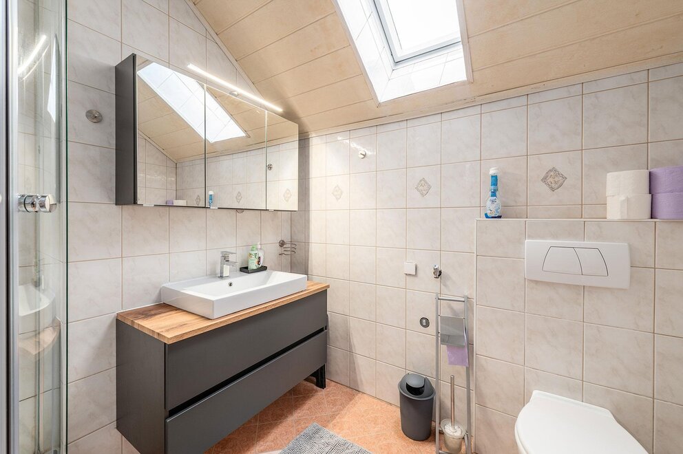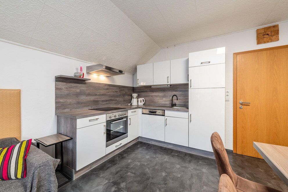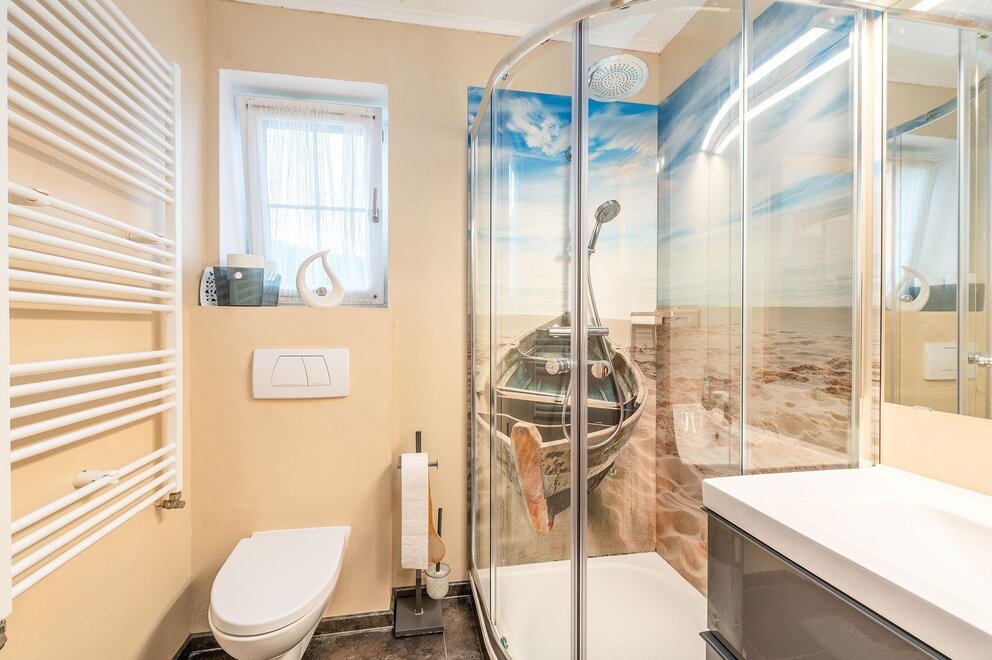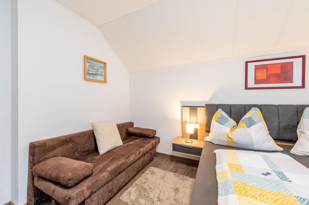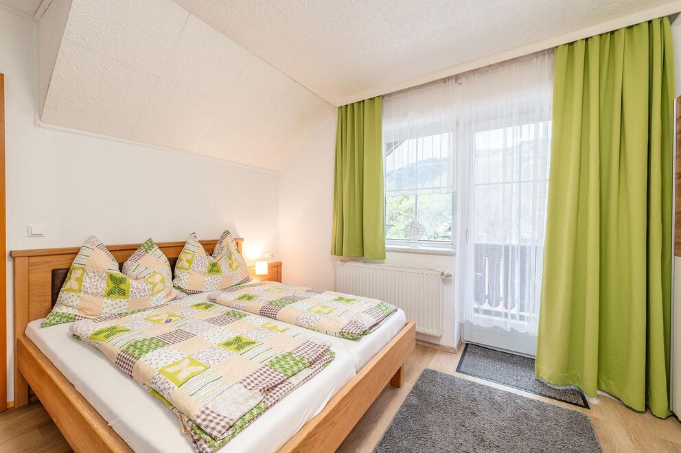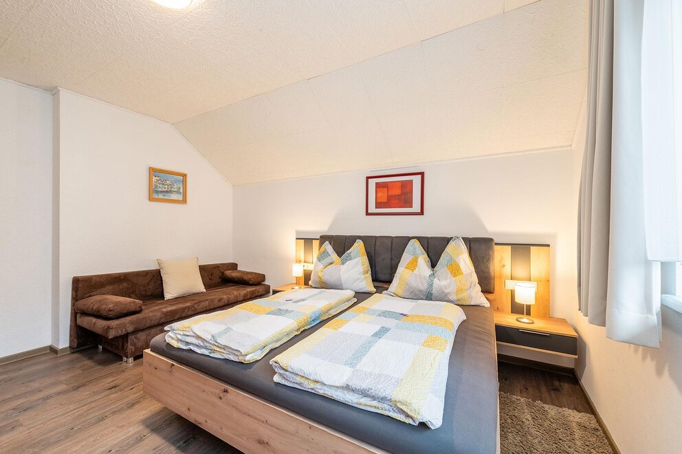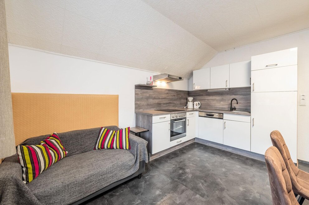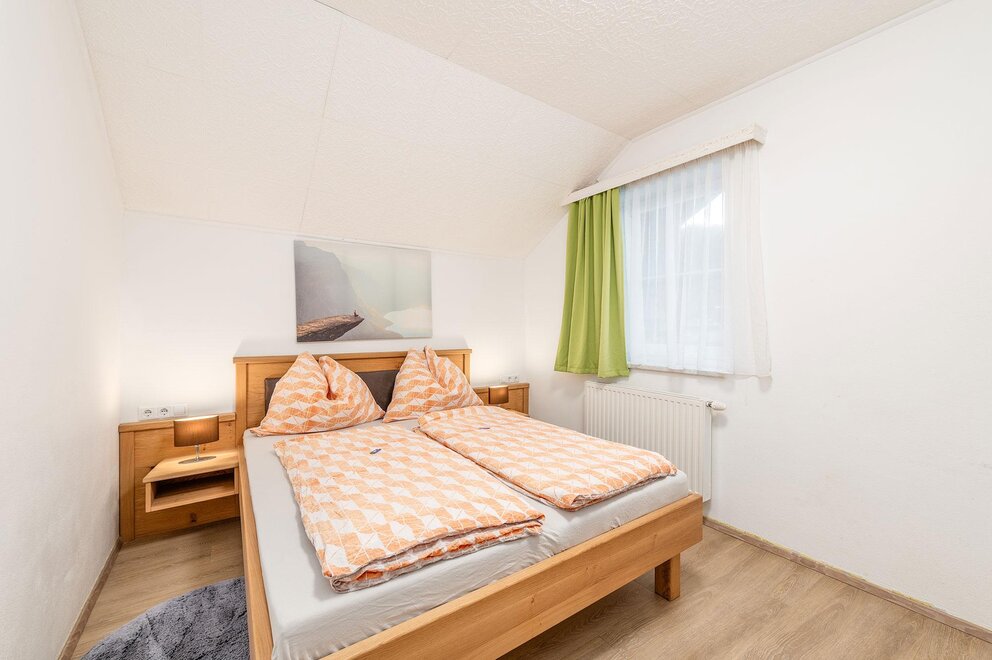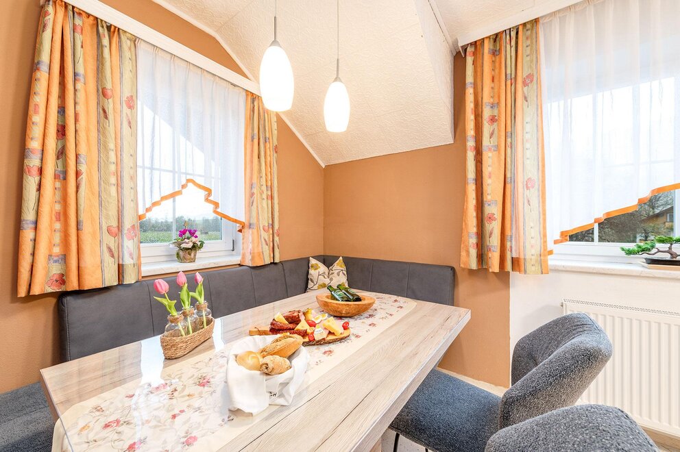 Apartmán se nachází v prvním patře a nabízí místo pro až šest hostů. Dvě ložnice se manželskými postelemi (180 cm), jedno jednolůžko (90 cm) a pohodlná rozkládací pohovka zajišťují flexibilní možnosti spaní.Světlá, plně vybavená kuchyň s jídelním stolem je ideální pro společné jídlo. Z prostorného obývacího pokoje je nádherný výhled do zeleně – perfektní pro slunečné hodiny a pohodové večery. K dispozici je Wi-Fi a bezplatné parkoviště. Domácí zvířata jsou vítána.