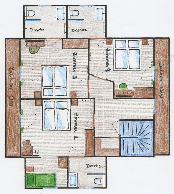 Nadzemní podlaží: 1 ložnice s manželskou postelí, samostatným lůžkem, TV, balkonem a koupelnou se sprchou/WC (východ), 1 ložnice s manželskou postelí, TV, koupelnou se sprchou/WC a balkonem (východ), 1 ložnice s manželskou postelí, TV, koupelnou se sprchou/WC a balkonem (západ)Podzemní podlaží: Sauna, lyžárna a sušárna, koupelna s vanou, WC, pračka