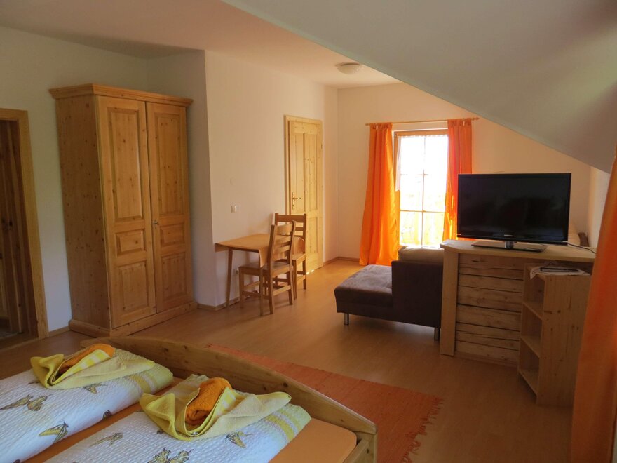 Panorama víceložnicové pokoje (studia) v podkroví, 2 balkony, s panoramatickým výhledem, velká, bezbariérová koupelna, s oknem Vybavení: Velká rozkládací pohovka pro 2 osoby v obytné části s TV a stolem, spací část se skříní a manželskou postelí.-