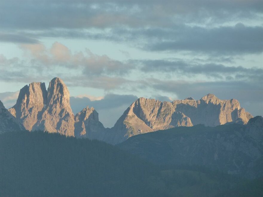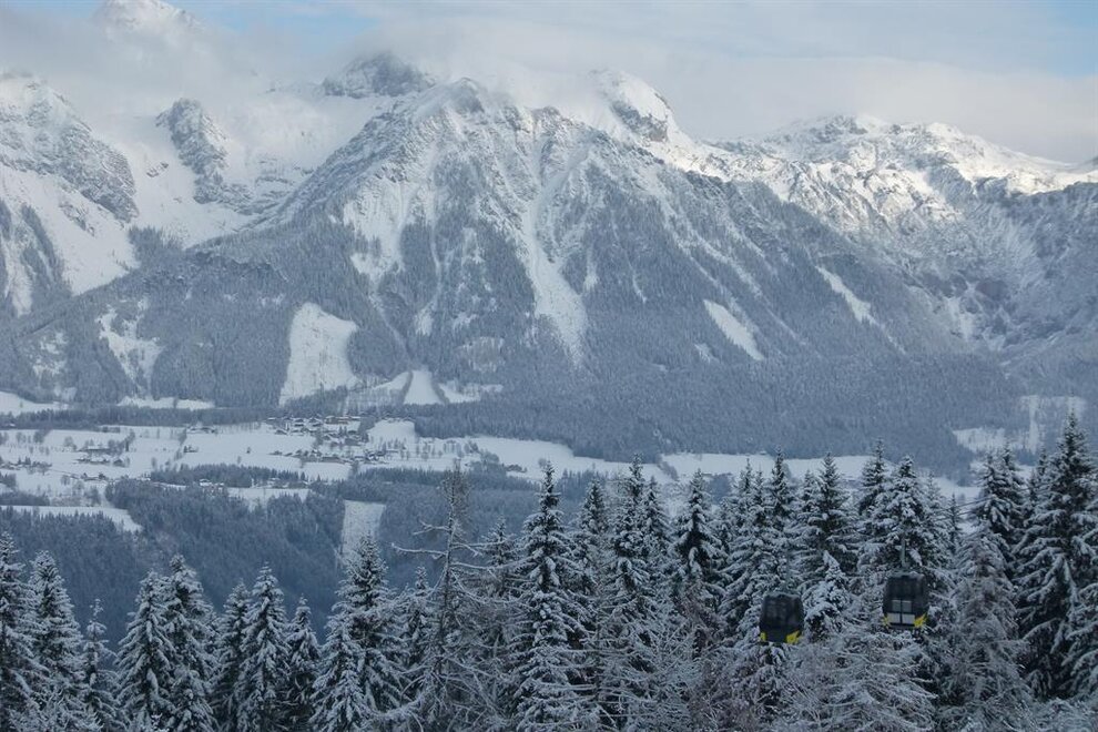 Romantika večera, s horským veselím v našem útulném dřevěném domě s nádhernou zimní zahradou a volným panoramatickým výhledem na celé pohoří Dachstein, Bischofsmütze, Hochkönig.... co lze také zažít na naší panoramatické terase, je jednoduše jedinečné na celé Planai!
