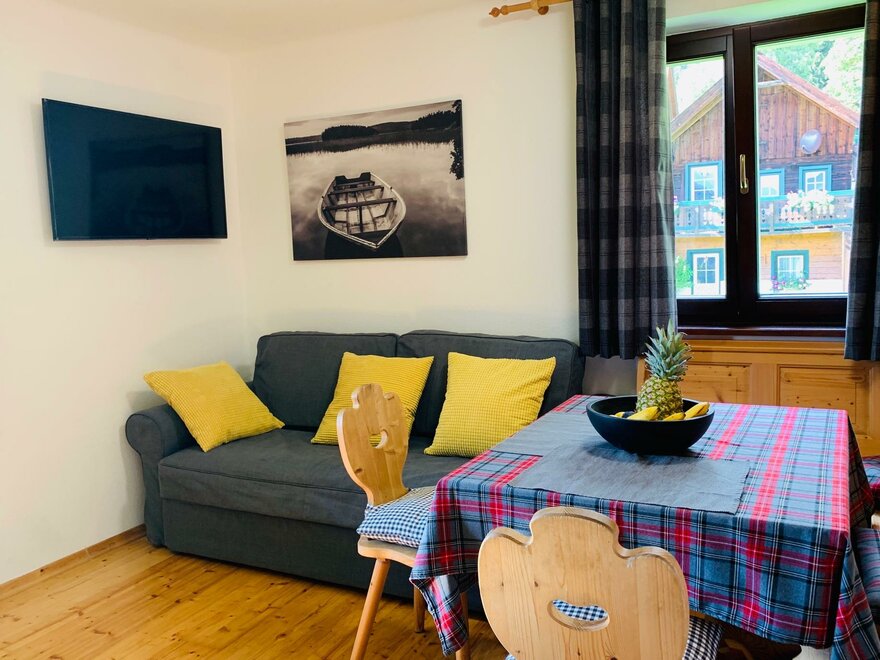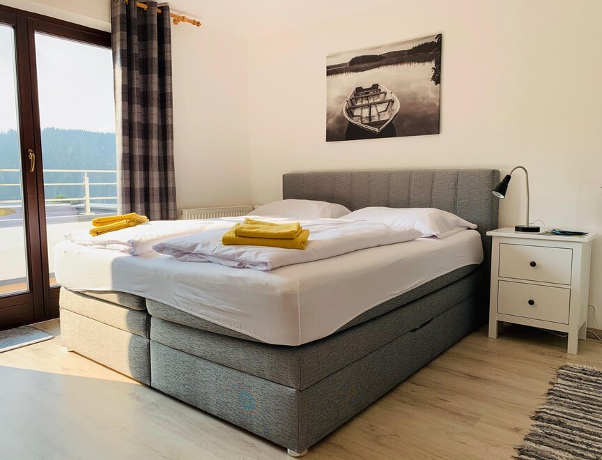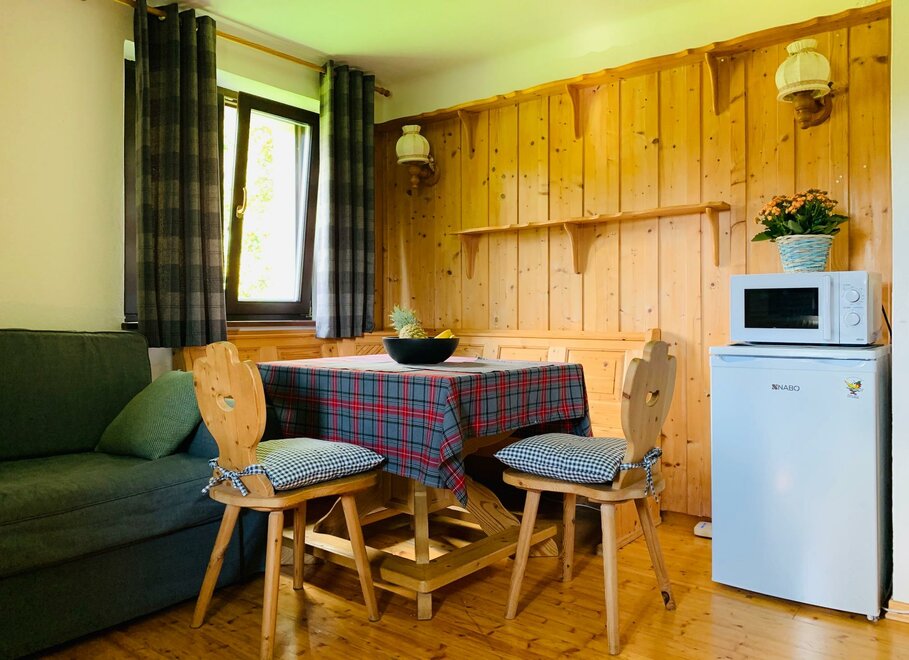 Apartmán (40 m²) je vybaven ložnicí (manželská postel a rozkládací postel), kuchyní se sedací soupravou, pohovkou a plochou televizí, a koupelnou se sprchou a WC. Zvláštním vrcholem obou bytů je balkon s výhledem na okolní horskou krajinu, kde si můžete ráno užívat první sluneční paprsky a večer si pohodlně vychutnat den.
