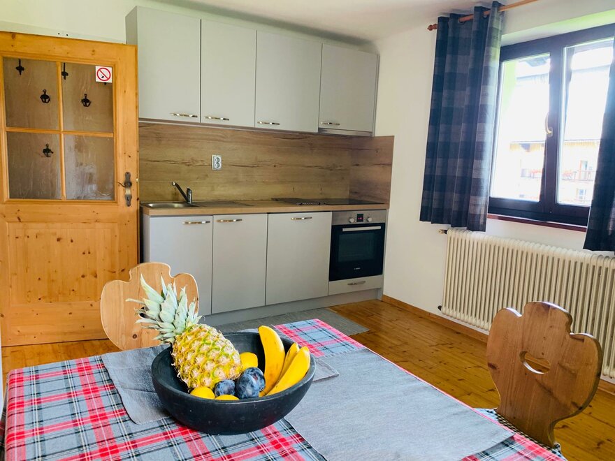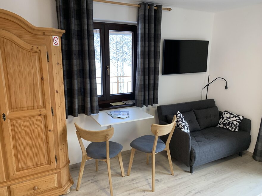 V našem Bergkristallhaus si můžete vybrat mezi studiem pro 2 osoby a apartmánem pro až 4 osoby (2 dospělí + 2 děti). Studio (20 m²) má obývací ložnici s manželskou postelí, kuchyňský kout, pohovku, malý jídelní kout a plochou televizi, stejně jako koupelnu se sprchou a WC.
