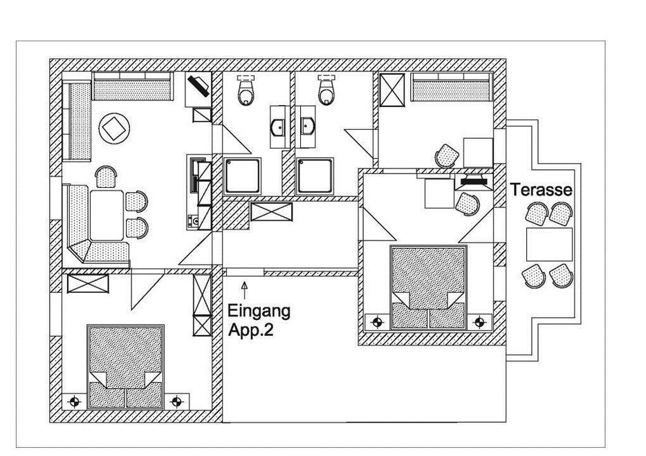 V apartmánu 2 a v prázdninovém domě jsou vždy 2 koupelny a WC.