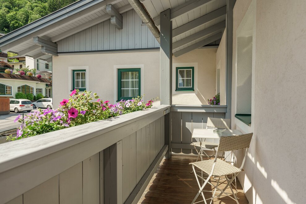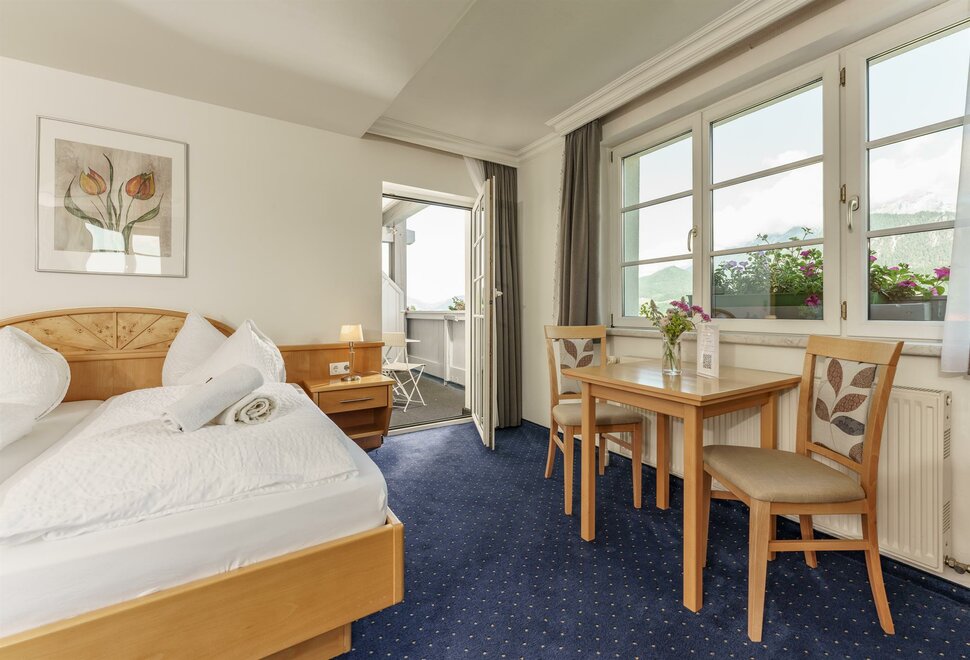 Renovovaný komfortní dvoulůžkový pokoj s boxspring postelí, plochou TV, sprchou/WC, fénem, zdarma W-Lan! Balkon s balkonovým nábytkem, výhled do údolí na zahradu a na masiv Dachstein! Lednička je také k dispozici!