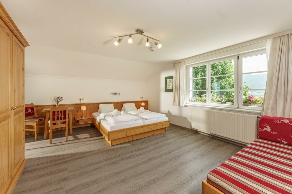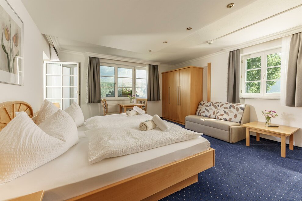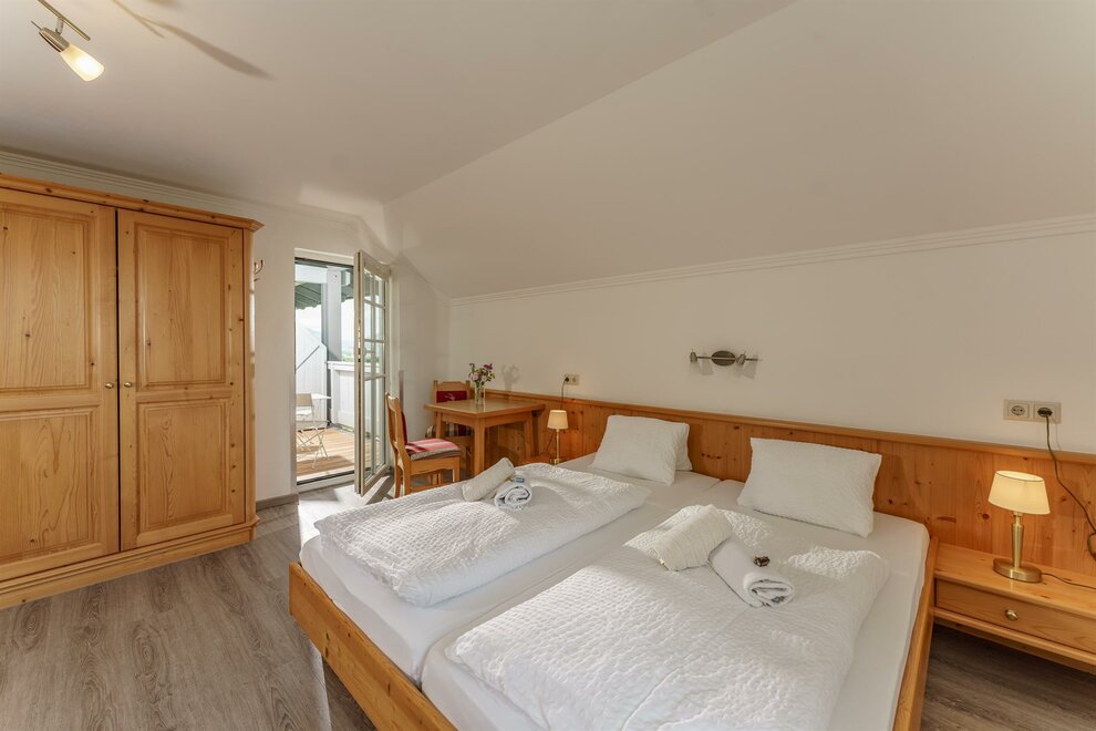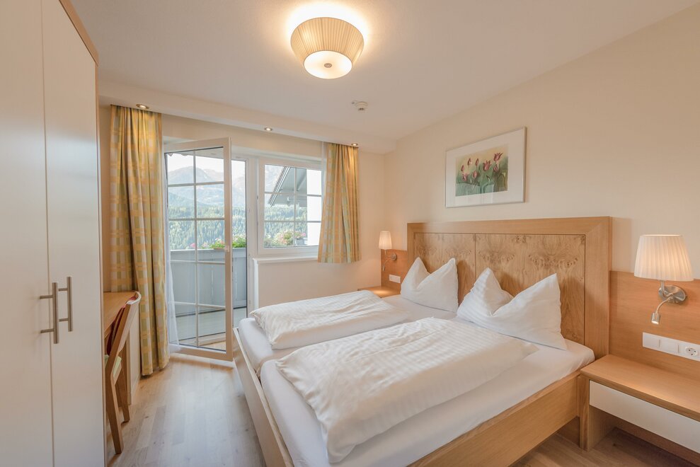 Zrenovovaný komfortní dvoulůžkový pokoj s boxspring postelí, plochou TV, sprchou/WC, fénem, bezplatným Wi-Fi! Balkon s balkonovým nábytkem, výhledem do údolí na zahradu a na masiv Dachstein! Chladnička je také k dispozici!