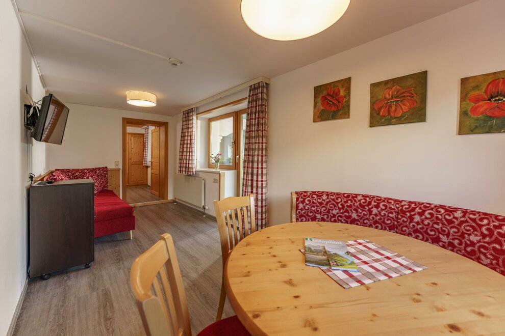 Nový rodinný pokoj ve 2. patře, 45m² velký, světlá parketová podlaha s oddělenými ložnicemi, předsíň, obývací pokoj s velkým stolem.
