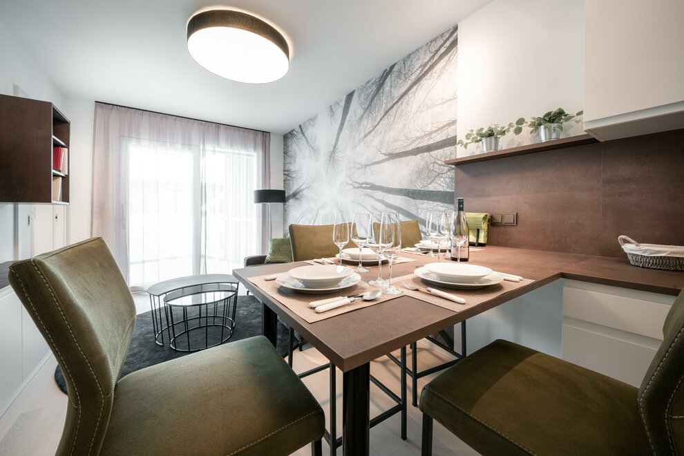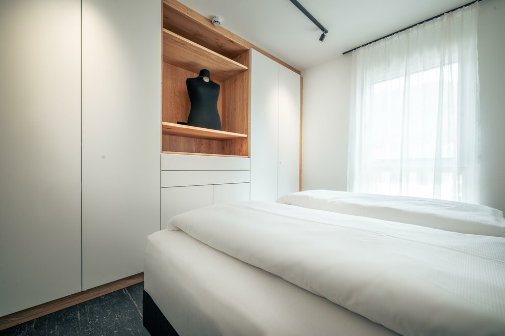 11 apartmánů – od zahrady, studia, komfortu, superior po penthouse – každý s balkonem nebo terasou, každý klidný, od jedné do dvou ložnic, plně vybavené kuchyně, podzemní garáže, lyžárny, cyklostojanu, Wi-Fi… to je Conrad – komfort!