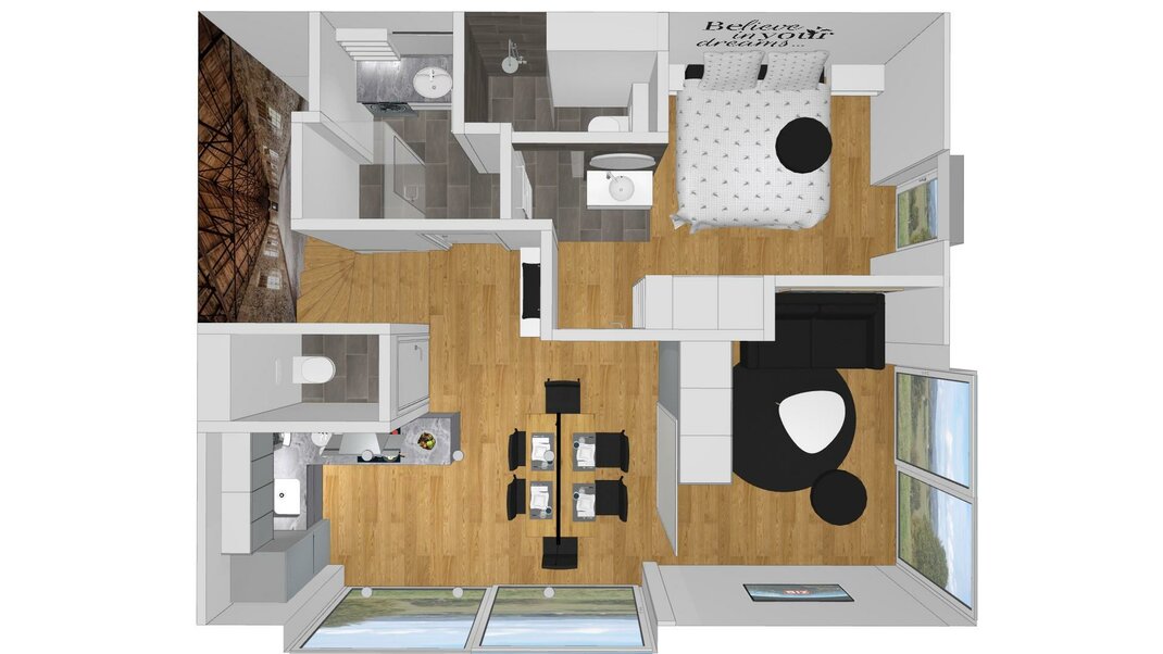 - 2 ložnice s manželskou postelí, z toho 1 ložnice se soukromou koupelnou