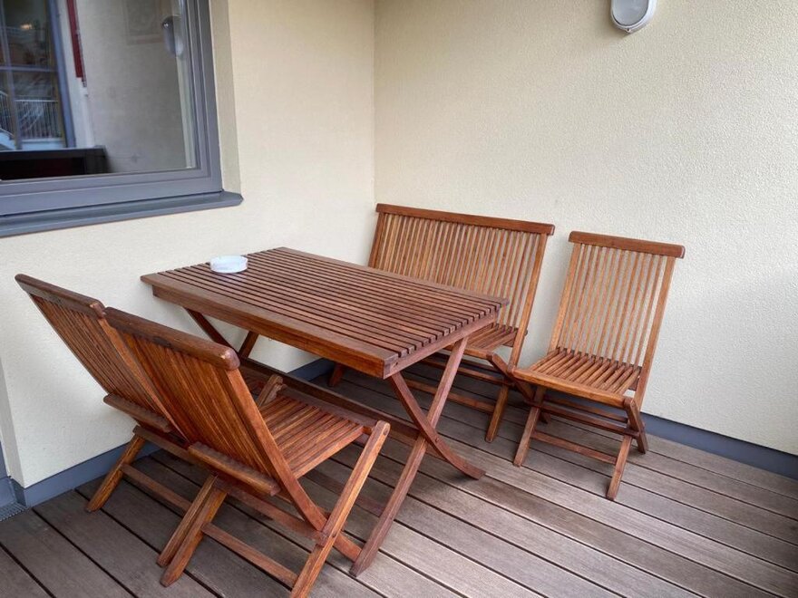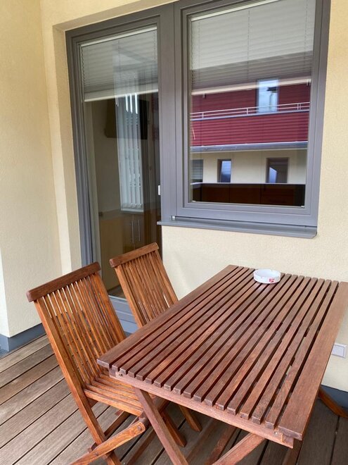 Z balkonu s balkonovým nábytkem si můžete vychutnat výhled na hory.
