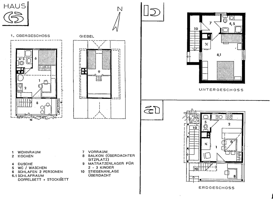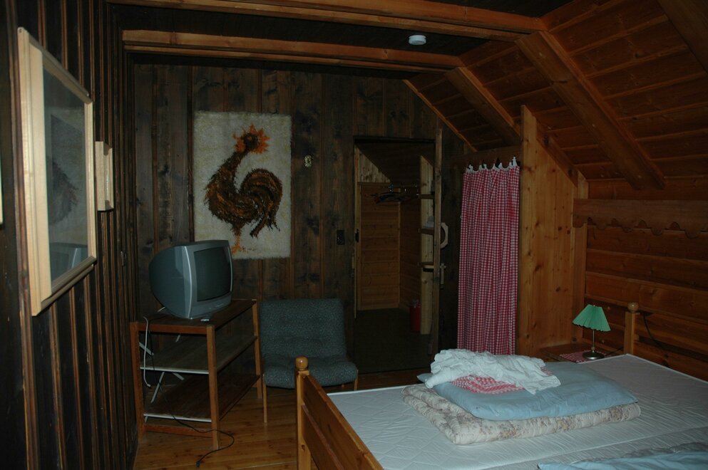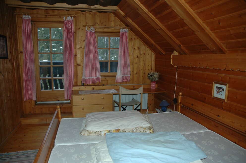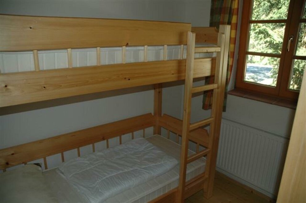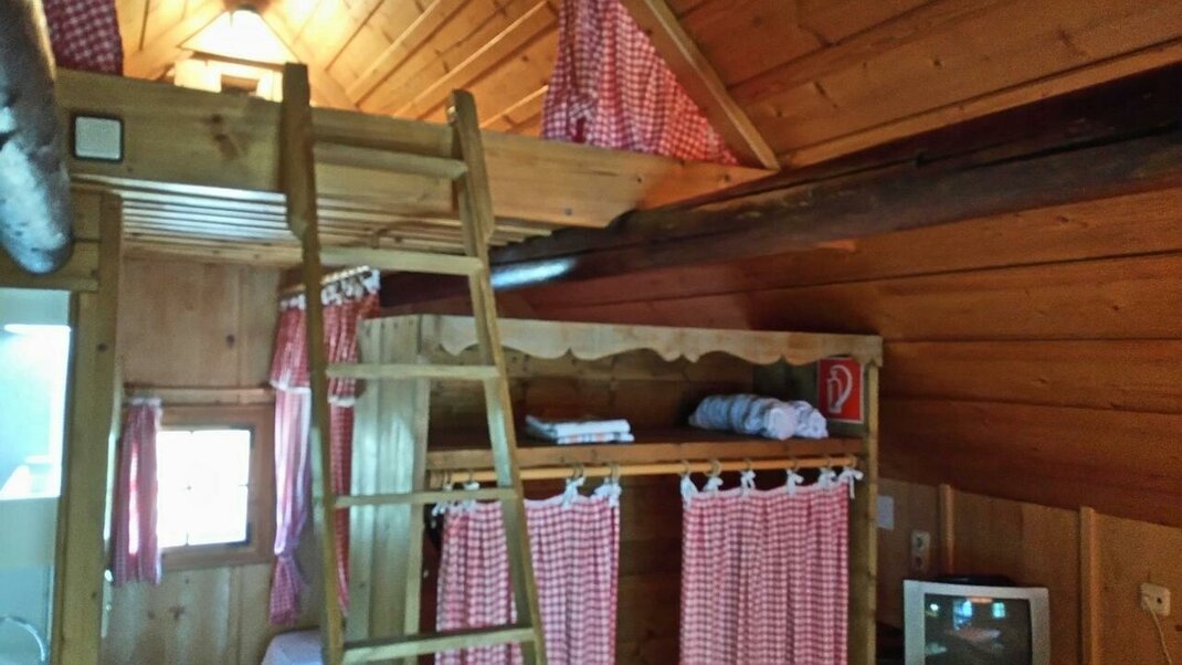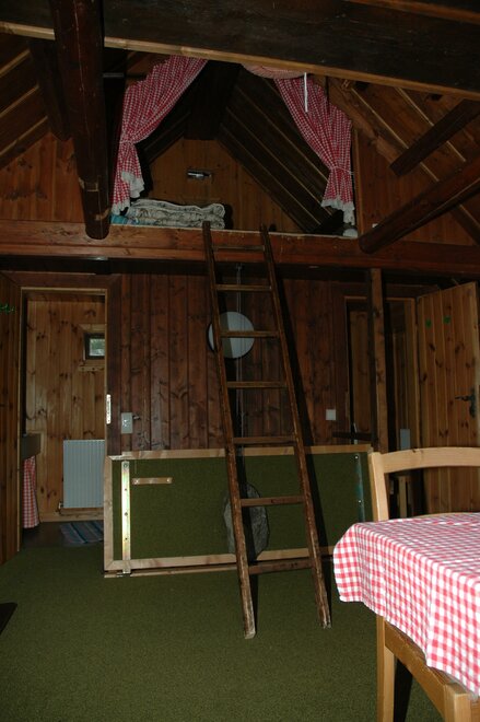 Přízemí: předsíň, WC, obývací prostor s možností spaní pro 2 osoby, kuchyň, TV, 1. patro: ložnice pro 2 osoby, sprcha, WC, 4 spací místa v podkroví (po žebříku), balkonVybavení pokojů