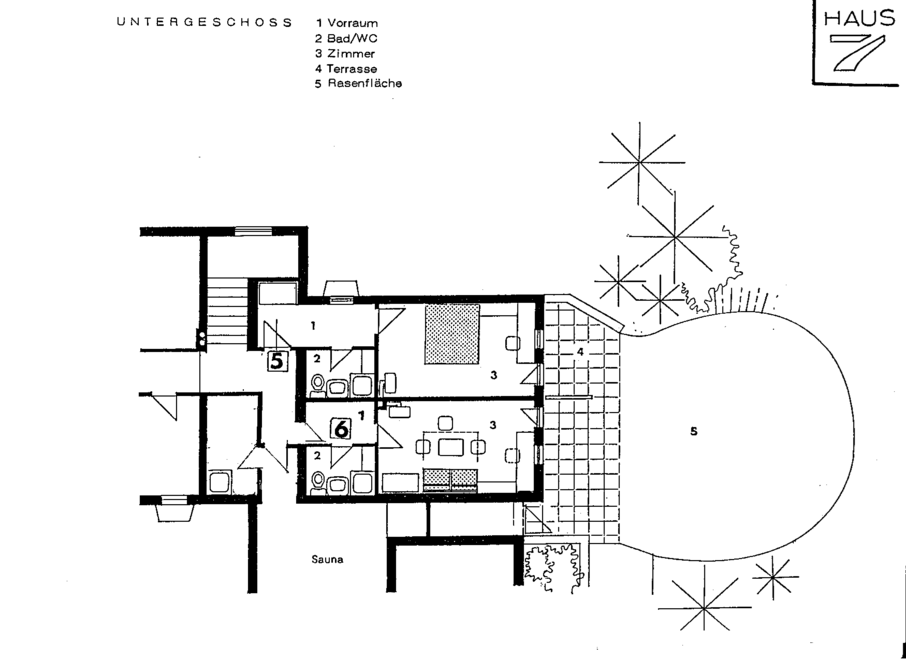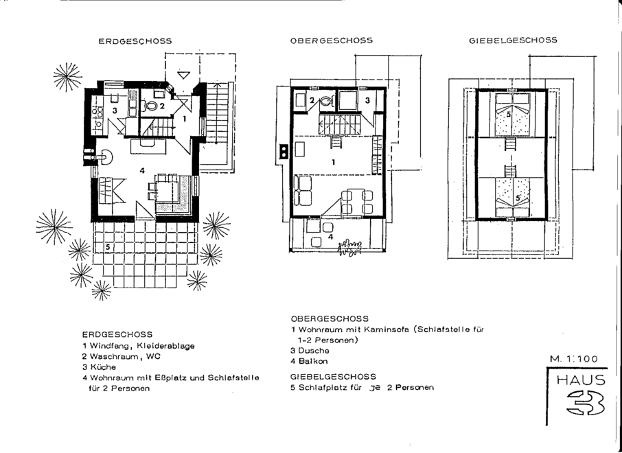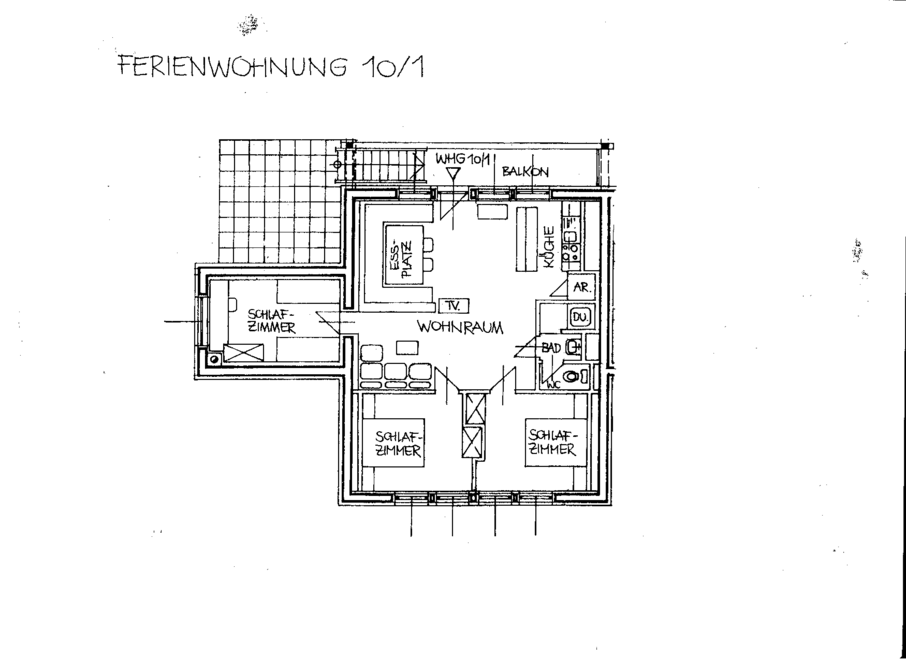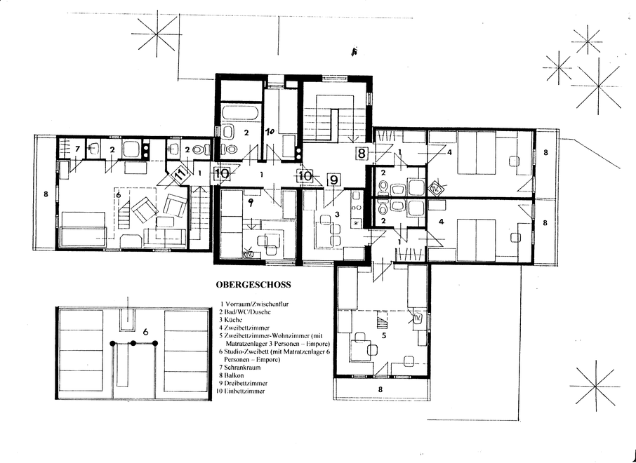 2 dvoulůžkové pokoje; 1 pokoj se 2 samostatnými lůžky, WC, sprcha, kuchyňský kout, TV-Sat zařízení, sklad, balkon