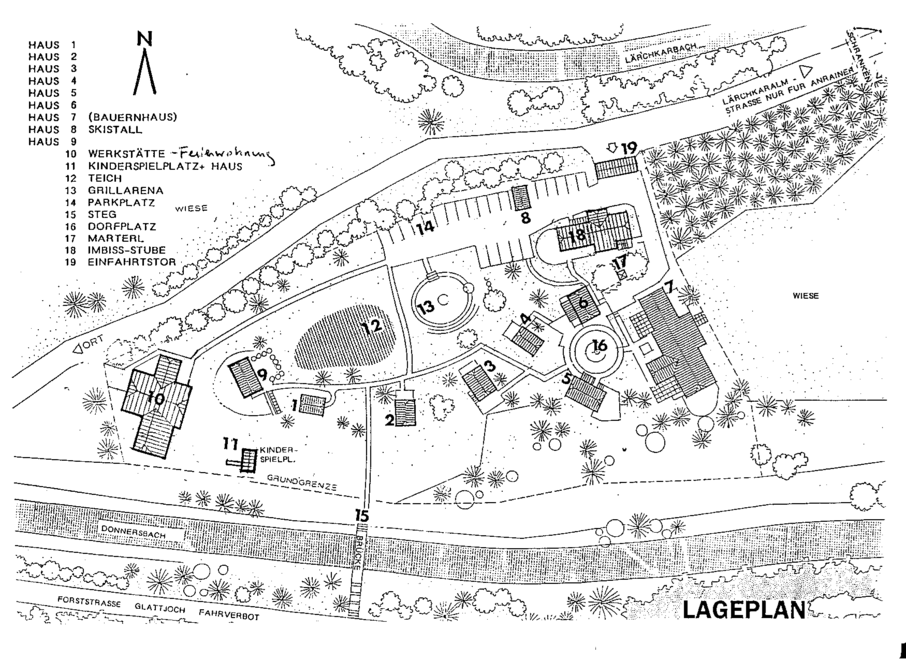 Naše rekreační zařízení s hospůdkou se nachází ve výšce 1100 m nad mořem uprostřed květinami bohaté, dvěma potoky obklopené alpské louky o rozloze 1 ha na konci zpevněné silnice. Skládá se z 6 rekreačních domů a jednoho apartmánového domu z obilných sýpek ze 17. a 18. století. Pobyty kratší než 4 dny pouze s polopenzí.